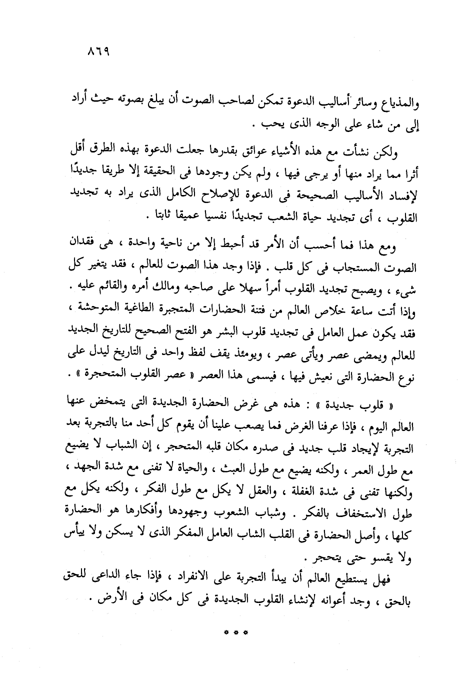 ومع هذا فما أحسب أن الأمر قد أحبط إلا من ناحية واحدة، هي فقدان الصوت المستجاب في كل قلب. فإذا وجد هذا الصوت للعالم، فقد يتغير كل شيء، ويصبح تجديد القلوب أمرًا سهلا على صاحبه ومالك أمره والقائم عليه. وإذا أتت ساعة خلاص العالم من فتنة الحضارات المتجبرة الطاغية المتوحشة، فقد يكون عمل العامل في تجديد قلوب البشر هو الفتح الصحيح للتاريخ الجديد للعالم ويمضي عصر ويأتي عصر، ويومئذ يقف لفظ واحد في التاريخ ليدل على نوع الحضارة التي نعيش فيها، فيسمى هذا العصر "عصر القلوب المتحجرة".