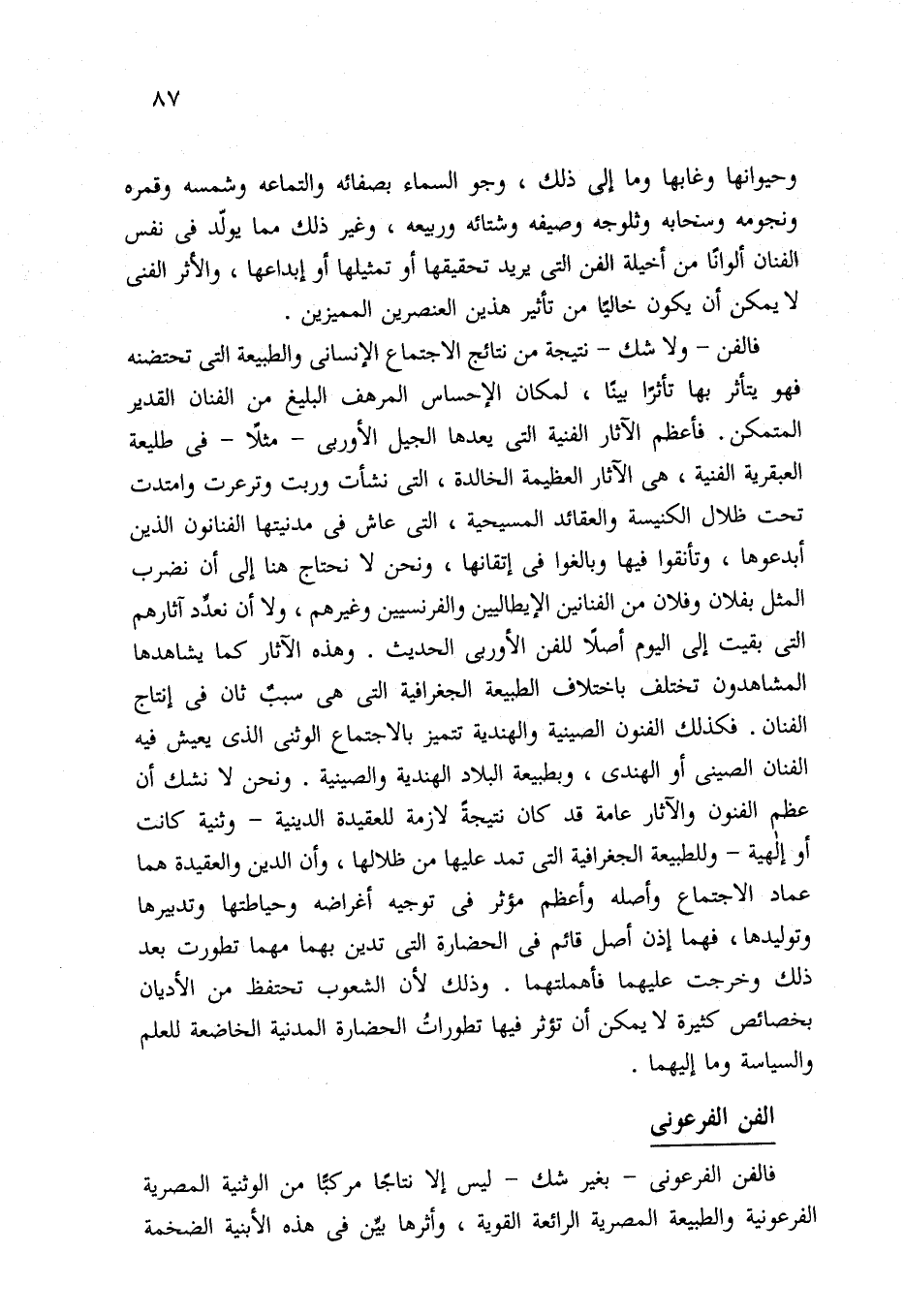 فالفن -ولا شك- نتيجة من نتائج الاجتماع الإنساني والطبيعة التي تحتضنه فهو يتأثر بها تأثرًا بينًا، لمكان الإحساس المرهف البليغ من الفنان القدير المتمكن. فأعظم الآثار الفنية التي يعدها الجيل الأوربي -مثلًا- في طليعة العبقرية الفنية، هي الآثار العظيمة الخالدة، التي نشأت وربت وترعرت وامتدت تحت ظلال الكنيسة والعقائد المسيحية، التي عاش في مدنيتها الفنانون الذين أبدعوها، وتأنقوا فيها وبالغوا في إتقانها، ونحن لا نحتاج هنا إلى أن نضرب المثل بفلان وفلان من الفنانين الإيطاليين والفرنسيين وغيرهم، ولا أن نعدِّد آثارهم التي بقيت إلى اليوم أصلًا للفن الأوربي الحديث. وهذه الآثار كما يشاهدها المشاهدون تختلف باختلاف الطبيعة الجغرافية التي هي سببٌ ثان في إنتاج الفنان. فكذلك الفنون الصينية والهندية تتميز بالاجتماع الوثني الذي يعيش فيه الفنان الصيني أو الهندي، وبطبيعة البلاد الهندية والصينية. ونحن لا نشك أن عظم الفنون والآثار عامة قد كان نتيجةً لازمة للعقيدة الدينية -وثنية كانت أو إلهية- وللطبيعة الجغرافية التي تمد عليها من ظلالها، وأن الدين والعقيدة هما عماد الاجتماع وأصله وأعظم مؤثر في توجيه أغراضه وحياطتها وتدبيرها وتوليدها، فهما إذن أصل قائم في الحضارة التي تدين بهما مهما تطورت بعد ذلك وخرجت عليهما فأهملتهما. وذلك لأن الشعوب تحتفظ من الأديان بخصائص كثيرة لا يمكن أن تؤثر فيها تطوراتُ الحضارة المدنية الخاضعة للعلم والسياسة وما إليهما.