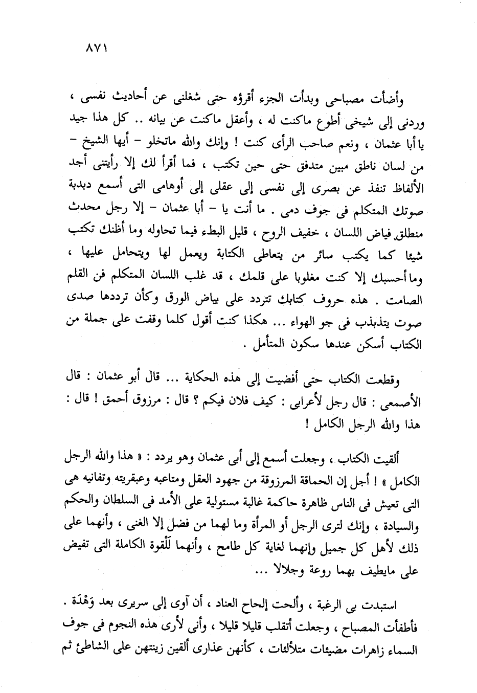 ألقيت الكتاب، وجعلت أسمع إلى أبي عثمان وهو يردد: "هذا والله الرجل الكامل"! أجل إن الحماقة المرزوقة من جهود العقل ومتاعبه وعبقريته وتفانيه هي التي تعيش في الناس ظاهرة حاكمة غالبة مستولية على الأمد في السلطان والحكم والسيادة، وإنك لترى الرجل أو المرأة وما لهما من فضل إلا الغني، وأنهما على ذلك لأهل كل جميل وإنهما لغاية كل طامح، وأنهما لَلْقوة الكاملة التي تفيض على ما يطيف بهما روعة وجلالا. . .