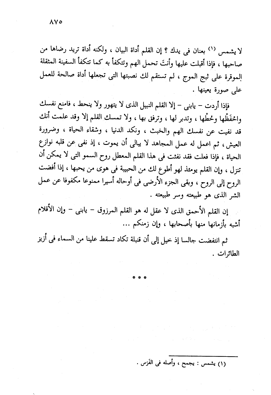فإذا أردت -يا بني- إلا القلم النبيل الذي لا يتهور ولا ينحط، فامنع نفسك واحْفَظها وحُطْها، وتدبر لها، وترفق بها، ولا تمسك القلم إلا وقد علمت أنك قد نفيت عن نفسك الهم والخبث، ونكد الدنيا، وشقاء الحياة، وضرورة العيش، ثم اعمل له عمل المجاهد لا يبالى أن يموت، إذ نفي عن قلبه نوازع الحياة، فإذا فعلت فقد نفثت في هذا القلم المعطل روح السمو التي لا يمكن أن تنزل، وإن القلم يومئذ لهو أطوع لك من الحبيبة في هوى من يحبها، إذا أفضت الروح إلى الروح، وبقى الجزء الأرضي في أوحاله أسيرا ممنوعا مكفوفا عن عمل الشر الذي هو طبيعته وسر طبيعته.