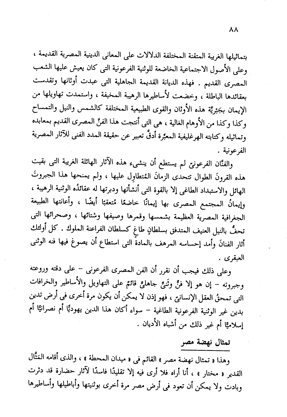 وهذا "تمثال نهضة مصر" القائم في "ميدان المحطة"، والذي أقامه المَثَّال القدير "مختار"، أنا أراه فلا أرى فيه إلا تقليدًا فاسدًا لآثار حضارة قد دثرت وبادت ولا يمكن أن تعود في أرض مصر مرة أخرى بوثنيتها وأباطيلها وأساطيرها