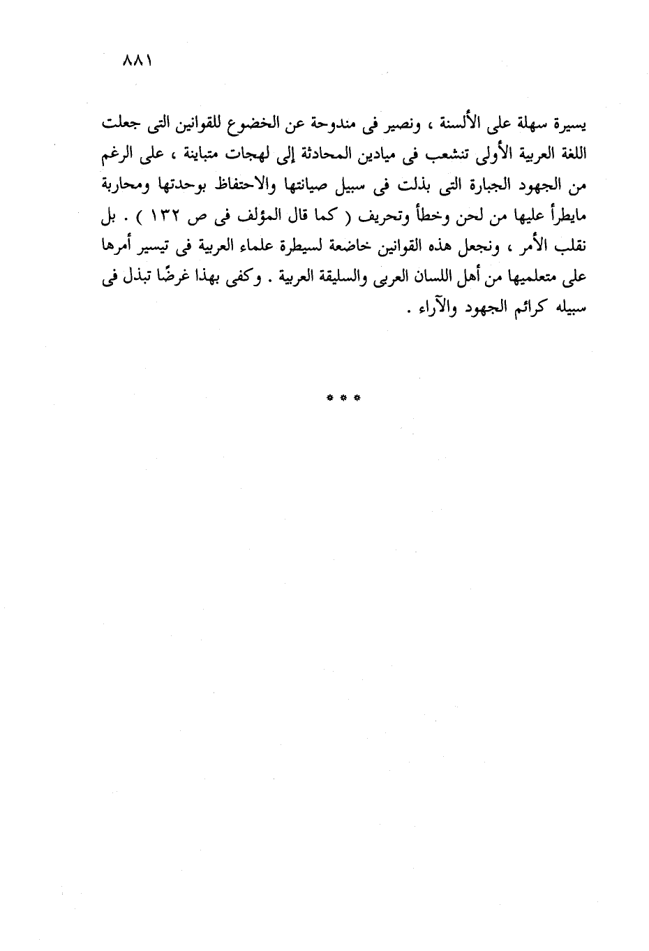 يسيرة سهلة على الألسنة، ونصير في مندوحة عن الخضوع للقوانين التي جعلت اللغة العربية الأولى تنشعب في ميادين المحادثة إلى لهجات متباينة، على الرغم من الجهود الجبارة التي بذلت في سبيل صيانتها والاحتفاظ بوحدتها ومحاربة ما يطرأ عليها من لحن وخطأ وتحريف (كما قال المؤلف في ص 132). بل نقلب الأمر، ونجعل هذه القوانين خاضعة لسيطرة علماء العربية في تيسير أمرها على متعلميها من أهل اللسان العربي والسليقة العربية. وكفي بهذا غرضًا تبذل في سبيله كرائم الجهود والآراء.