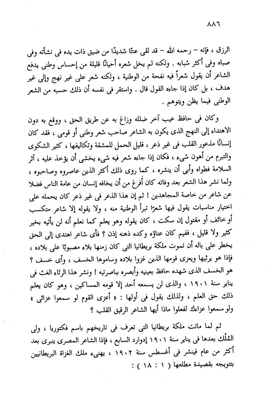 وكان في حافظ عيب آخر ضلله وزاغ به عن طريق الحق، ووقع به دون الاهتداء إلى النهج الذي يكون به الشاعر صاحب شعر وطنى أو قومى، فقد كان إنسانًا مذعور القلب في غير ذعر، قليل الحمل للمشقة وتكاليفها، كثير الشكوى والتبرم من أهون شيء، فكان إذا جاءه شعر فيه شيء يخشى أن يؤخذ عليه، آثر السلامة فطواه وأبى أن ينشره، كما روى ذلك أكثر الذين عاصروه وصاحبوه، ولما نشر هذا الشعر بعد وفاته كان أفرغ من أن يخافه إنسان من عامة الناس فضلا عن شاعر من خاصة المجاهدين! ثم إن هذا الذعر في غير ذعر كان يحمله على اختيار مناسبات يقول فيها شعرًا تبرأ الوطنية منه، ولا يقوله إلا شاعر متكسب أو خائف أو مقتول إن سكت، كان يقوله وهو يعلم كما يعلم أنه لن يأتيه بخير كثير ولا قليل، ففيم كان عناؤه وكده ذهنه إذن؟ فأي شاعر اهتدى إلى الحق يخطر على باله أن تموت ملكة بريطانيا التي كان زمنها بلاء مصبوبًا على بلاده، فإذا هو يرثيها ويعزى قومها الذين غزوا بلاده وساموها الخسف، وأي خسف؟ هو الخسف الذي شهده حافظ بعينيه وأبصره بباصرتيه! ونشر هذا الرثاء الغث في يناير سنة 1901، والذي لن يسمعه أحد إلا قومه المساكين، وهو كان يعلم ذلك حق العلم، ولذلك يقول في أولها: "أعزى القوم لو سمعوا عزائي" ولو سمعوا عزاءك لفعلوا ماذا أيها الشاعر الرقيق القلب؟