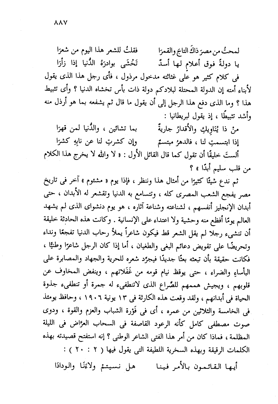 ثم ندع شيئًا كثيرًا من أمثال هذا وننظر، فإذا يوم "مشئوم" آخر في تاريخ مصر يفجع الشعب المصري كله، وتتسامع به الدنيا وتقشعر له الأبدان، حتى أبدان الإنجليز أنفسهم، لشناعته وشناعة آثاره، هو يوم دنشواى الذي لم يشهد العالم يومًا أفظع منه وحشية ولا اعتداء على الإنسانية. وكانت هذه الحادثة خليقة أن تنشيء رجلا لم يقل الشعر قط فيكون شاعرًا يملأ رحاب الدنيا تفجعًا ونداء وتحريضًا على تقويض دعائم البغي والطغيان، أما إذا كان الرجل شاعرًا وطنيًا، فكانت حقيقة بأن تبعثه بعثا جديدًا فيجرِّد شعره للحرية والجهاد والمصابرة على البأساءِ والضراء، حتى يوقظ نيام قومه من غَفَلاتهم، وينفض المخاوف عن قلوبهم، ويجيش هممهم للصِّراع الذي لا تنطفيء له جمرة أو تنطفيء جذوة الحياة في أبدانهم، ولقد وقعت هذه الكارثة في 13 يونية 1906، وحافظ يومئذ في الخامسة والثلاثين من عمره، أي في فَوْرة الشباب والعزم والقوة، ودوى صوت مصطفى كامل كأنه الرعود القاصفة في السحاب العرَّاض في الليلة المظلمة، فماذا كان من أمر هذا الفتى الشاعر الوطني؟ إنه استفتح قصيدته بهذه الكلمات الرقيقة وبهذه السخرية اللطيفة التي يقول فيها (2: 20):