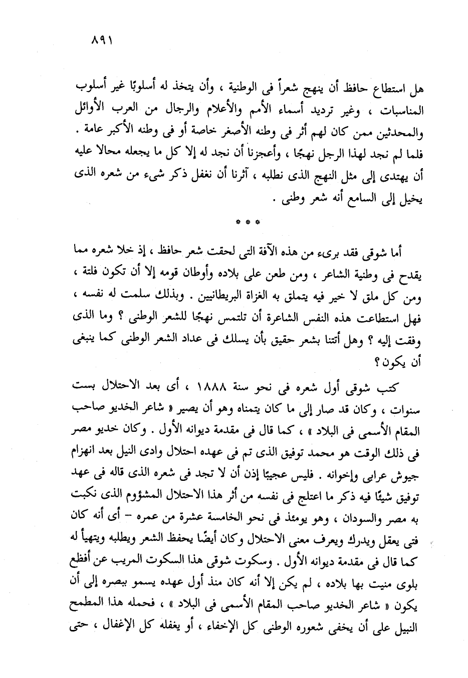 أما شوقى فقد برئ من هذه الآفة التي لحقت شعر حافظ، إذ خلا شعره مما يقدح في وطنية الشاعر، ومن طعن على بلاده وأوطان قومه إلا أن تكون فلتة، ومن كل ملق لا خير فيه يتملق به الغزاة البريطانيين. وبذلك سلمت له نفسه، فهل استطاعت هذه النفس الشاعرة أن تلتمس نهجًا للشعر الوطنى؟ وما الذي وفقت إليه؟ وهل أتتنا بشعر حقيق بأن يسلك في عداد الشعر الوطنى كما ينبغي أن يكون؟