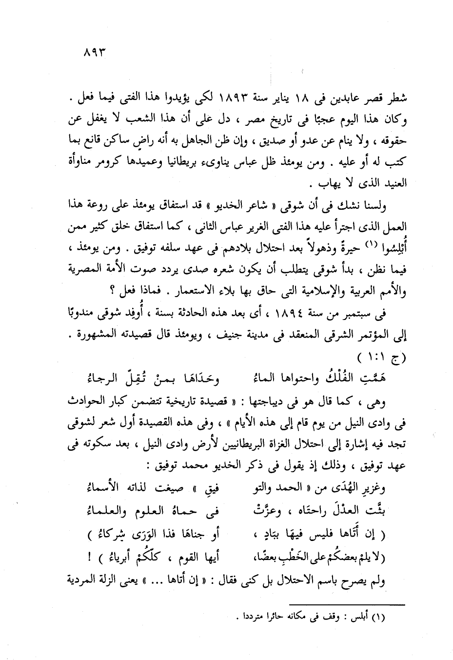 ولسنا نشك في أن شوقى "شاعر الخديو" قد استفاق يومئذ على روعة هذا العمل الذي اجترأ عليه هذا الفتى الغرير عباس الثاني، كما استفاق خلق كثير ممن أُبْلِسُوا (¬1) حيرةً وذهولًا بعد احتلال بلادهم في عهد سلفه توفيق. ومن يومئذ، فيما نظن، بدأ شوقي يتطلب أن يكون شعره صدى يردد صوت الأمة المصرية والأمم العربية والإسلامية التي حاق بها بلاء الاستعمار. فماذا فعل؟