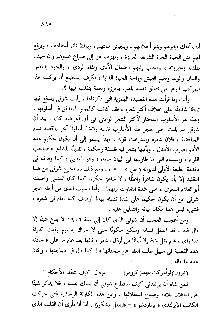 فمن شاء أن يرشدنى كيف استطاع شوقى أن يملك نفسه، فلا يذكر شيئًا عن احتلال بلاده وضياع استقلالها، وعن هذه الكارثة الوحشية التي حركت الكاتب الإيرلندى "برناردشو" -فليفعل مشكورًا. أما أنا فأرى أن القلب الذي