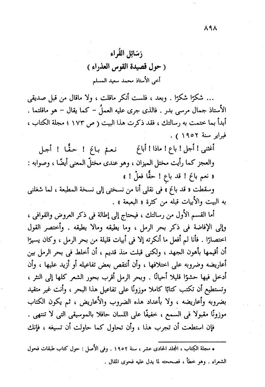 . . . شكرًا شكرًا. وبعد، فلست أنكر ما قلت، ولا ما قال من قبل صديقي الأستاذ جمال مرسى بدر. فالذي جرى عليه العملُ -كما يقال- هو ما قلتما. أبدأ بما ختمت به رسالتك، فقد ذكرت هذا البيت (ص 173؛ مجلة الكتاب، فبراير سنة 1952).