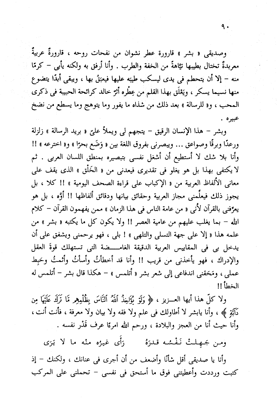 وبشر -هذا الإنسان الرقيق- يتجهم لي ويملأ عليّ "بريد الرسالة" زلزلة ورعدًا وبرقًا وصواعق. . . ويبصرني بفروق اللغة بين "وَضَع بحرًا" و"اخترعه"! ! وأنا بلا شك لا أستطيع أن أشغل نفسي بتبصيره بمنطق اللسان العربي. ثم لا يكتفي بهذا بل هو يغلو في تقديري فيعدني من "الخَلْق" الذي يقف على معاني الألفاظ العربية من "الإكباب على قراءة الصحف اليومية"! ! كلا، بل يجوز ذلك فيعلِّمني مجاز العربية وحقائق بيانها ودقائق ألفاظها! ! أوَّه، بل هو يعرِّفني بالقرآن لأني "من عامة الناس في هذا الزمان" ممن يفهمون القرآن -كلام الله- بما يغلب عليهم من عامية العصر! ! ولا يكون كل ما يكتبه "بشر" من علمه هذا "إلا على جهة التسلي والتلهي"! بلى، فهو يرحمني ويشفق على أن يدخل بي في المقاييس العربية الدقيقة الغامضة التي تستهلك قوةَ العقل والإدراك، فهو يأخذني من قريب! ! وأنا قد أخطأتُ وأسأتُ وأثمتُ وحَبِط عملى، ومَحَقني اندفاعي إلى شعر بشر "أتلمس" -هكذا قال بشر- أتلمس له الخطأ! !
