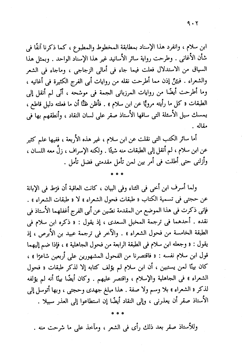 ابن سلام، وانفرد هذا الإسناد بمطابقة المخطوط والمطبوع، كما ذكرنا آنفًا في شأن الأغانى. وطرحت رواية سائر الأسانيد غير هذا الإسناد الواحد. وبمثل هذا السياق من الاستدلال فعلت فيما جاء في أمالى الزجاجى، وما جاء في الشعر والشعراء. فبيّنٌ إذن مما أطرحت نقله من روايات أبي الفرج الكثيرة في أغانيه، وما أطرحت أيضًا من روايات المرزبانى الجمة في موشحه، أنّى لم أنقل إلى الطبقات "كل ما رأيته مرويًّا عن ابن سلام". فأظن ظنًّا أن ما فعلته دليل قاطع، يمسك سيل الأسئلة التي ساقها الأستاذ صقر على لسان النقاد، وأنطقهم بها في مقاله.