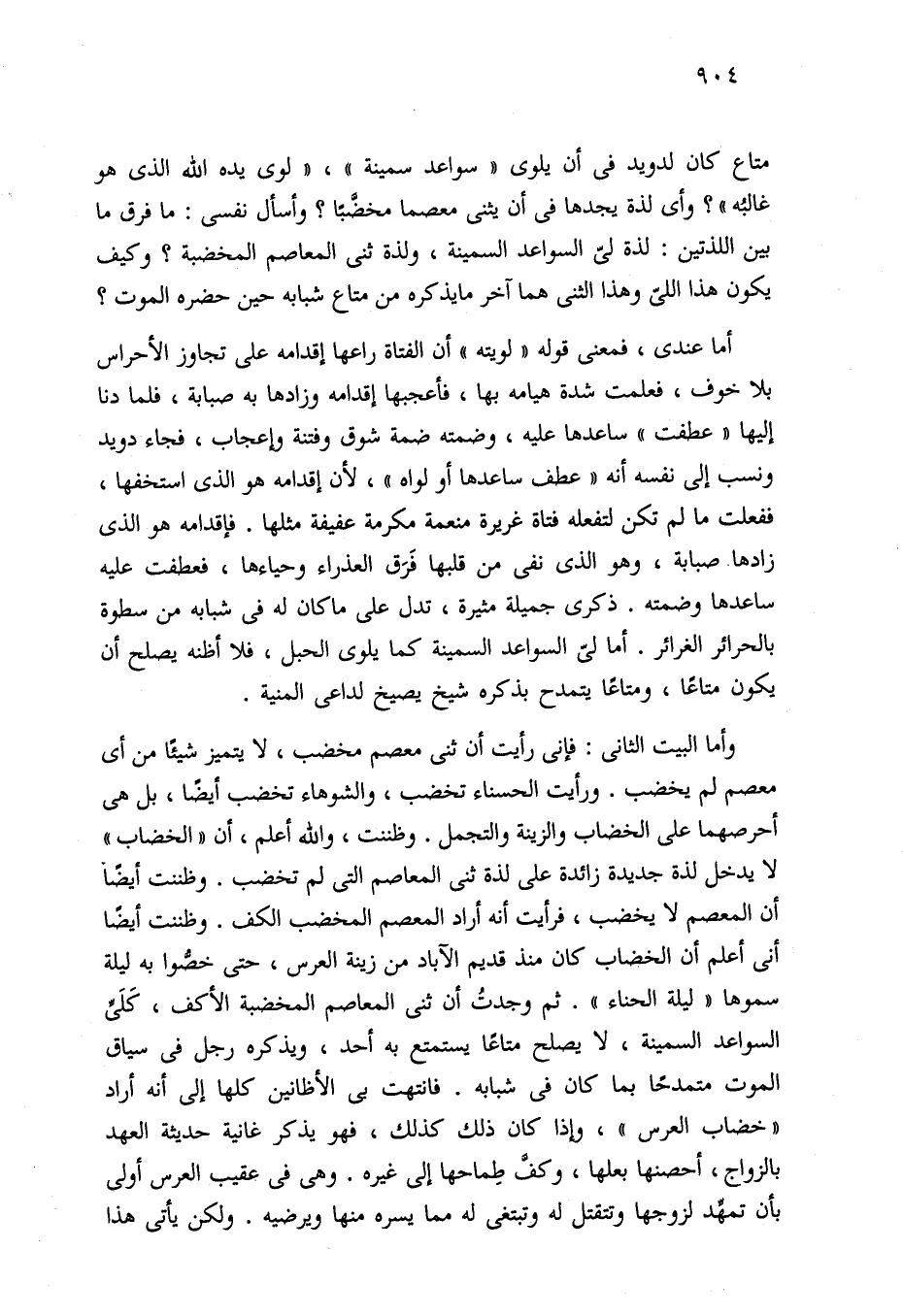 وأما البيت الثاني: فإني رأيت أن ثنى معصم مخضب، لا يتميز شيئًا من أي معصم لم يخضب. ورأيت الحسناء تخضب، والشوهاء تخضب أيضًا، بل هي أحرصهما على الخضاب والزينة والتجمل. وظننت، والله أعلم، أن "الخضاب" لا يدخل لذة جديدة زائدة على لذة ثنى المعاصم التي لم تخضب. وظننت أيضًا أن المعصم لا يخضب، فرأيت أنه أراد المعصم المخضب الكف. وظننت أيضًا أنى أعلم أن الخضاب كان منذ قديم الآباد من زينة العرس، حتى خصُّوا به ليلة سموها "ليلة الحناء". ثم وجدتُ أن ثنى المعاصم المخضبة الأكف، كَلَىِّ السواعد السمينة، لا يصلح متاعًا يستمتع به أحد، ويذكره رجل في سياق الموت متمدحًا بما كان في شبابه. فانتهت بى الأظانين كلها إلى أنه أراد "خضاب العرس"، وإذا كان ذلك كذلك، فهو يذكر غانية حديثة العهد بالزواج، أحصنها بعلها، وكفَّ طِماحها إلى غيره. وهي في عقيب العرس أولى بأن تمهِّد لزوجها وتتقتل له وتبتغى له مما يسره منها ويرضيه. ولكن يأتي هذا