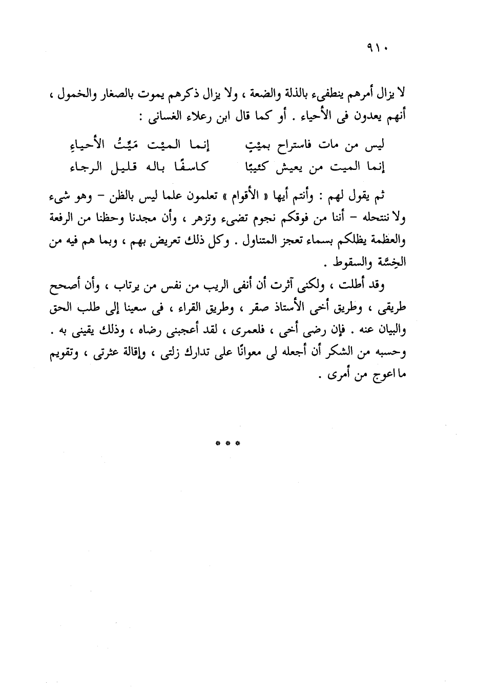 وقد أطلت، ولكني آثرت أن أنفي الريب من نفس من يرتاب، وأن أصحح طريقى، وطريق أخي الأستاذ صقر، وطريق القراء، في سعينا إلى طلب الحق والبيان عنه. فإن رضى أخي، فلعمرى، لقد أعجبنى رضاه، وذلك يقينى به. وحسبه من الشكر أن أجعله لي معوانًا على تدارك زلتى، وإقالة عثرتى، وتقويم ما اعوج من أمري.