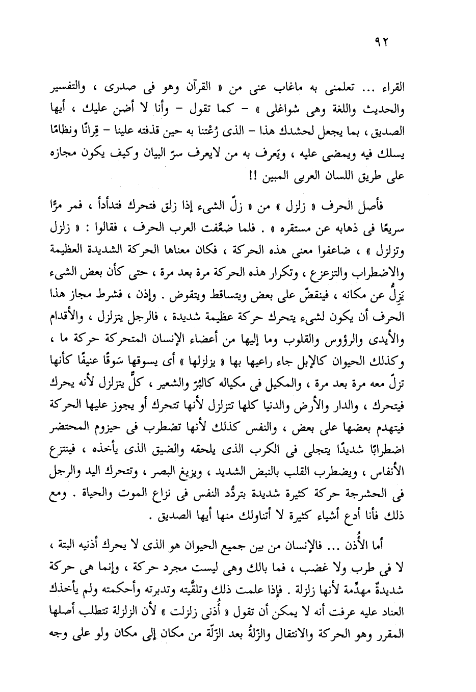 فأصل الحرف "زلزل" من "زلّ الشيء إذا زلق فتحرك فتدأدأ، فمر مرًّا سريعًا في ذهابه عن مستقره". فلما ضعَّفت العرب الحرف، فقالوا: "زلزل وتزلزل"، ضاعفوا معنى هذه الحركة، فكان معناها الحركة الشديدة العظيمة والاضطراب والتزعزع، وتكرار هذه الحركة مرة بعد مرة، حتى كأن بعض الشيء يَزِلُّ عن مكانه، فينقضّ على بعض ويتساقط ويتقوض. وإذن، فشرط مجاز هذا الحرف أن يكون لشيء يتحرك حركة عظيمة شديدة، فالرجل يتزلزل، والأقدام والأيدي والرؤوس والقلوب وما إليها من أعضاء الإنسان المتحركة حركة ما، وكذلك الحيوان كالإبل جاء راعيها بها "يزلزلها" أي يسوقها سَوقًا عنيفًا كأنها تزلّ معه مرة بعد مرة، والمكيل في مكياله كالبُرّ والشعير، كلٌّ يتزلزل لأنه يحرك فيتحرك، والدار والأرض والدنيا كلها تتزلزل لأنها تتحرك أو يجوز عليها الحركة فيتهدم بعضها على بعض، والنفس كذلك لأنها تضطرب في حيزوم المحتضر اضطرابًا شديدًا يتجلى في الكرب الذي يلحقه والضيق الذي يأخذه، فينتزع الأنفاس، ويضطرب القلب بالنبض الشديد، ويزيغ البصر، وتتحرك اليد والرجل في الحشرجة حركة كثيرة شديدة بتردُّد النفس في نزاع الموت والحياة. ومع ذلك فأنا أدع أشياء كثيرة لا أتناولك منها أيها الصديق.