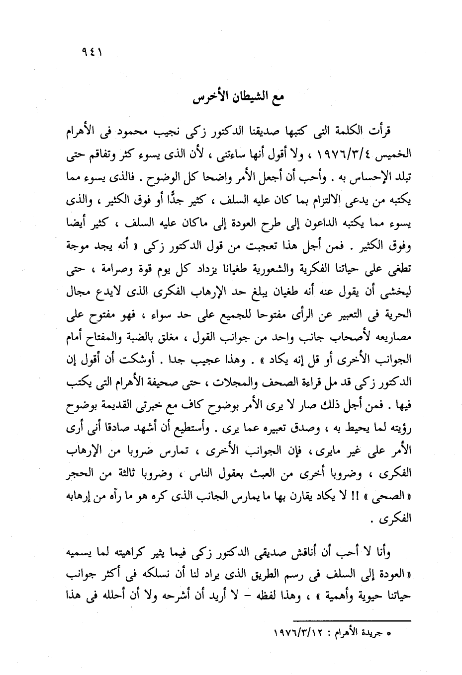 قرأت الكلمة التي كتبها صديقنا الدكتور زكي نجيب محمود في الأهرام الخميس 4/ 3/ 1976، ولا أقول أنها ساءتنى، لأن الذي يسوء كثر وتفاقم حتى تبلد الإحساس به. وأحب أن أجعل الأمر واضحا كل الوضوح. فالذي يسوء مما يكتبه من يدعى الالتزام بما كان عليه السلف، كثير جدًّا أو فوق الكثير، والذي يسوء مما يكتبه الداعون إلى طرح العودة إلى ما كان عليه السلف، كثير أيضا وفوق الكثير. فمن أجل هذا تعجبت من قول الدكتور زكي "أنه يجد موجة تطغى على حياتنا الفكرية والشعورية طغيانا يزداد كل يوم قوة وصرامة، حتى ليخشى أن يقول عنه أنه طغيان يبلغ حد الإرهاب الفكري الذي لا يدع مجال الحرية في التعبير عن الرأي مفتوحا للجميع على حد سواء، فهو مفتوح على مصاريعه لأصحاب جانب واحد من جوانب القول، مغلق بالضبة والمفتاح أمام الجوانب الأخرى أو قل إنه يكاد". وهذا عجيب جدا. أوشكت أن أقول إن الدكتور زكي قد مل قراءة الصحف والمجلات، حتى صحيفة الأهرام التي يكتب فيها. فمن أجل ذلك صار لا يرى الأمر بوضوح كاف مع خبرتى القديمة بوضوح رؤيته لما يحيط به، وصدق تعبيره عما يرى. وأستطيع أن أشهد صادقا أنى أرى الأمر على غير ما يرى، فإن الجوانب الأخرى، تمارس ضروبا من الإرهاب الفكري، وضروبا أخرى من العبث بعقول الناس، وضروبا ثالثة من الحجر "الصحي"! ! لا يكاد يقارن بها ما يمارس الجانب الذي كره هو ما رآه من إرهابه الفكري.