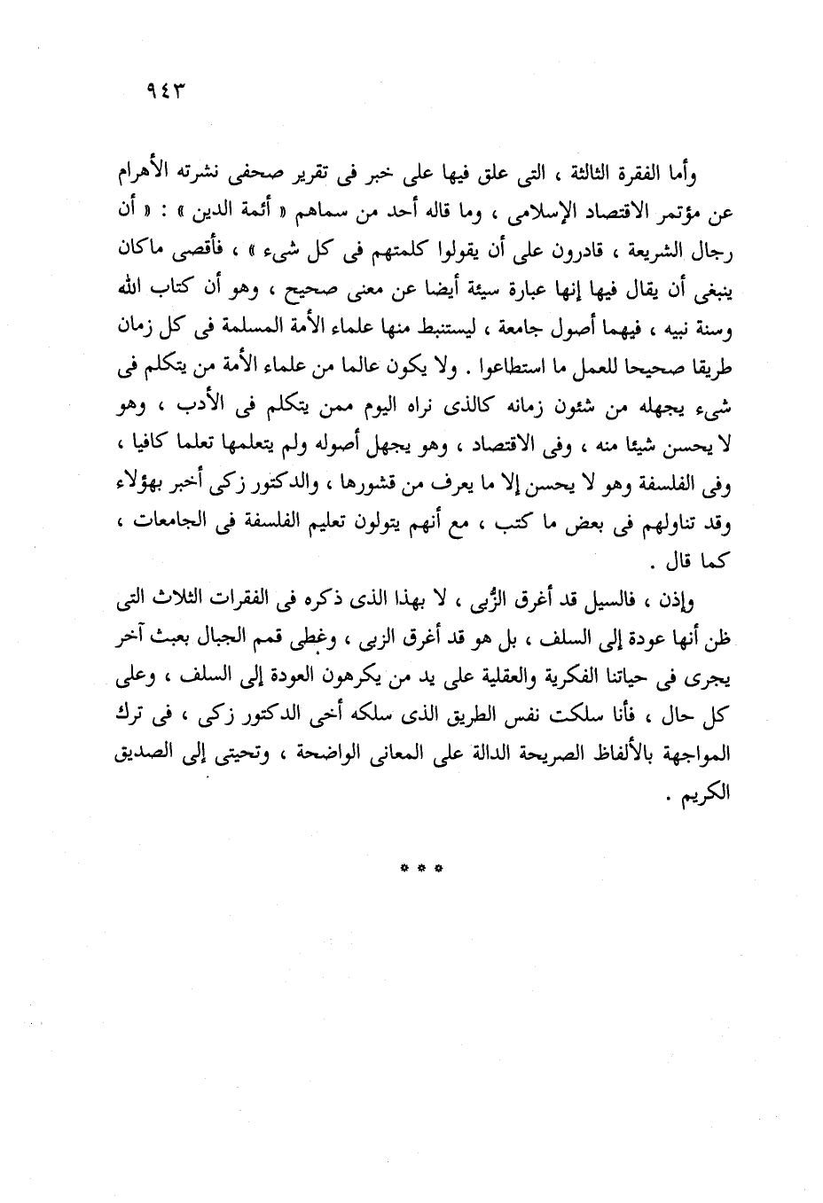 وأما الفقرة الثالثة، التي علق فيها على خبر في تقرير صحفي نشرته الأهرام عن مؤتمر الاقتصاد الإسلامي، وما قاله أحد من سماهم "أئمة الدين": "أن رجال الشريعة، قادرون على أن يقولوا كلمتهم في كل شيء"، فأقصى ما كان ينبغي أن يقال فيها إنها عبارة سيئة أيضا عن معنى صحيح، وهو أن كتاب الله وسنة نبيه، فيهما أصول جامعة، ليستنبط منها علماء الأمة المسلمة في كل زمان طريقا صحيحا للعمل ما استطاعوا. ولا يكون عالما من علماء الأمة من يتكلم في شيء يجهله من شئون زمانه كالذي نراه اليوم ممن يتكلم في الأدب، وهو لا يحسن شيئًا منه، وفي الاقتصاد، وهو يجهل أصوله ولم يتعلمها تعلما كافيا، وفي الفلسفة وهو لا يحسن إلا ما يعرف من قشورها، والدكتور زكي أخبر بهؤلاء وقد تناولهم في بعض ما كتب، مع أنهم يتولون تعليم الفلسفة في الجامعات، كما قال.