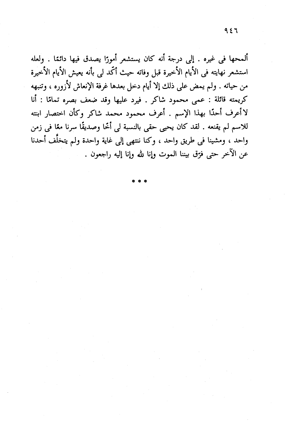 ألمحها في غيره. إلى درجة أنه كان يستشعر أمورًا يصدق فيها دائمًا. ولعله استشعر نهايته في الأيام الأخيرة قبل وفاته حيث أكد لي بأنه يعيش الأيام الأخيرة من حياته. ولم يمض على ذلك إلا أيام دخل بعدها غرفة الإنعاش لأزوره، وتنبهه كريمته قائلة: عمى محمود شاكر. فيرد عليها وقد ضعف بصره تمامًا: أنا لا أعرف أحدًا بهذا الإسم. أعرف محمود محمد شاكر وكأن اختصار ابنته للاسم لم يقنعه. لقد كان يحيى حقى بالنسبة لي أخًا وصديقًا سرنا معًا في زمن واحد، ومشينا في طريق واحد، وكنا ننتهي إلى غاية واحدة ولم يتخلَّف أحدنا عن الآخر حتى فرّق بيننا الموت وإنا لله وإنا إليه راجعون.