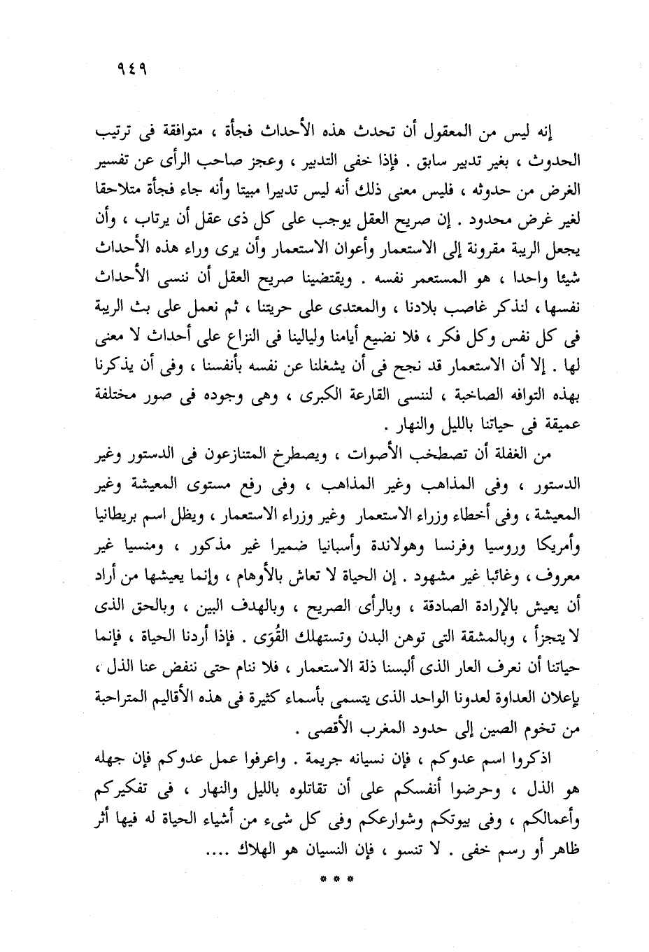 من الغفلة أن تصطخب الأصوات، ويصطرخ المتنازعون في الدستور وغير الدستور، وفي المذاهب وغير المذاهب، وفي رفع مستوى المعيشة وغير المعيشة، وفي أخطاء وزراء الاستعمار وغير وزراء الاستعمار، ويظل اسم بريطانيا وأمريكا وروسيا وفرنسا وهولاندة وأسبانيا ضميرا غير مذكور، ومنسيا غير معروف، وغائبا غير مشهود. إن الحياة لا تعاش بالأوهام، وإنما يعيشها من أراد أن يعيش بالإرادة الصادقة، وبالرأي الصريح، وبالهدف البين، وبالحق الذي لا يتجزأ، وبالمشقة التي توهن البدن وتستهلك القُوَى. فإذا أردنا الحياة، فإنما حياتنا أن نعرف العار الذي ألبسنا ذلة الاستعمار، فلا ننام حتى ننفض عنا الذل، بإعلان العداوة لعدونا الواحد الذي يتسمى بأسماء كثيرة في هذه الأقاليم المتراحبة من تخوم الصين إلى حدود المغرب الأقصى.