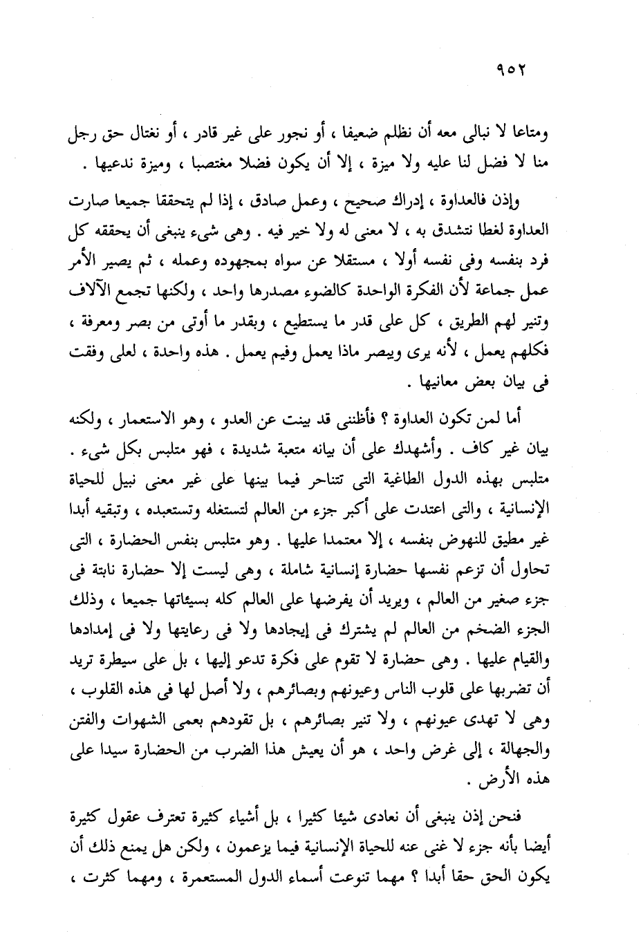 أما لمن تكون العداوة؟ فأظننى قد بينت عن العدو، وهو الاستعمار، ولكنه بيان غير كاف. وأشهدك على أن بيانه متعبة شديدة، فهو متلبس بكل شيء. متلبس بهذه الدول الطاغية التي تتناحر فيما بينها على غير معنى نبيل للحياة الإنسانية، والتي اعتدت على أكبر جزء من العالم لتستغله وتستعبده، وتبقيه أبدا غير مطيق للنهوض بنفسه، إلا معتمدا عليها. وهو متلبس بنفس الحضارة، التي تحاول أن تزعم نفسها حضارة إنسانية شاملة، وهي ليست إلا حضارة نابتة في جزء صغير من العالم، ويريد أن يفرضها على العالم كله بسيئاتها جميعا، وذلك الجزء الضخم من العالم لم يشترك في إيجادها ولا في رعايتها ولا في إمدادها والقيام عليها. وهي حضارة لا تقوم على فكرة تدعو إليها، بل على سيطرة تريد أن تضربها على قلوب الناس وعيونهم وبصائرهم، ولا أصل لها في هذه القلوب، وهي لا تهدى عيونهم، ولا تنير بصائرهم، بل تقودهم بعمى الشهوات والفتن والجهالة، إلى غرض واحد، هو أن يعيش هذا الضرب من الحضارة سيدا على هذه الأرض.