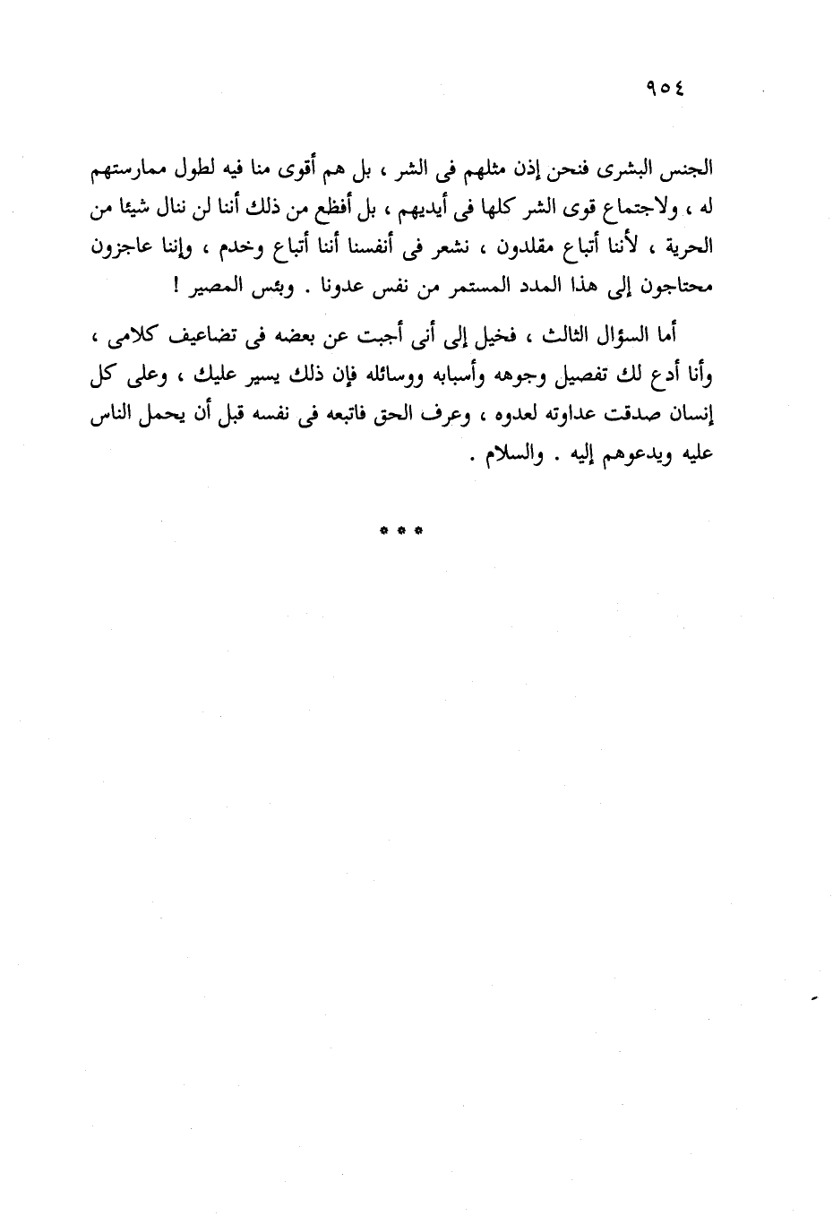 الجنس البشرى فنحن إذن مثلهم في الشر، بل هم أقوى منا فيه لطول ممارستهم له، ولاجتماع قوى الشر كلها في أيديهم، بل أفظع من ذلك أننا لن ننال شيئا من الحرية، لأننا أتباع مقلدون، نشعر في أنفسنا أننا أتباع وخدم، وإننا عاجزون محتاجون إلى هذا المدد المستمر من نفس عدونا. وبئس المصير!