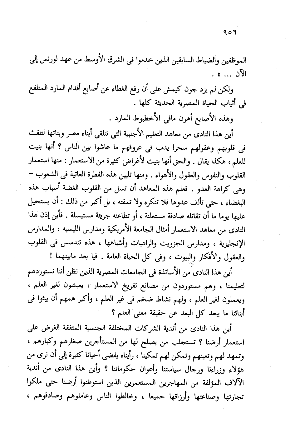 أين هذا النادى من معاهد التعليم الأجنبية التي تتلقى أبناء مصر وبناتها لتنفث في قلوبهم وعقولهم سحرا يدب في عروقهم ما عاشوا بين الناس؟ أنها بنيت للعلم، هكذا يقال. والحق أنها بنيت لأغراض كثيرة من الاستعمار: منها استعمار القلوب والنفوس والعقول والأهواء. ومنها تليين هذه الفطرة العاتية في الشعوب -وهي كراهة العدو. فعلم هذه المعاهد أن تسل من القلوب الغضة أسباب هذه البغضاء، حتى تألف عدوها فلا تنكره ولا تمقته، بل أكبر من ذلك: أن يستحيل عليها يوما ما أن تقاتله صادقة مستعلنة، أو تطاعنه جريئة مستبسلة. فأين إذن هذا النادى من معاهد الاستعمار أمثال الجامعة الأمريكية ومدارس الليسيه، والمدارس الإنجليزية، ومدارس الجزويت والراهبات وأشباهها، هذه تتدسس في القلوب والعقول والأفكار والبيوت، وفي كل الحياة العامة. فيا بعد ما بينهما!