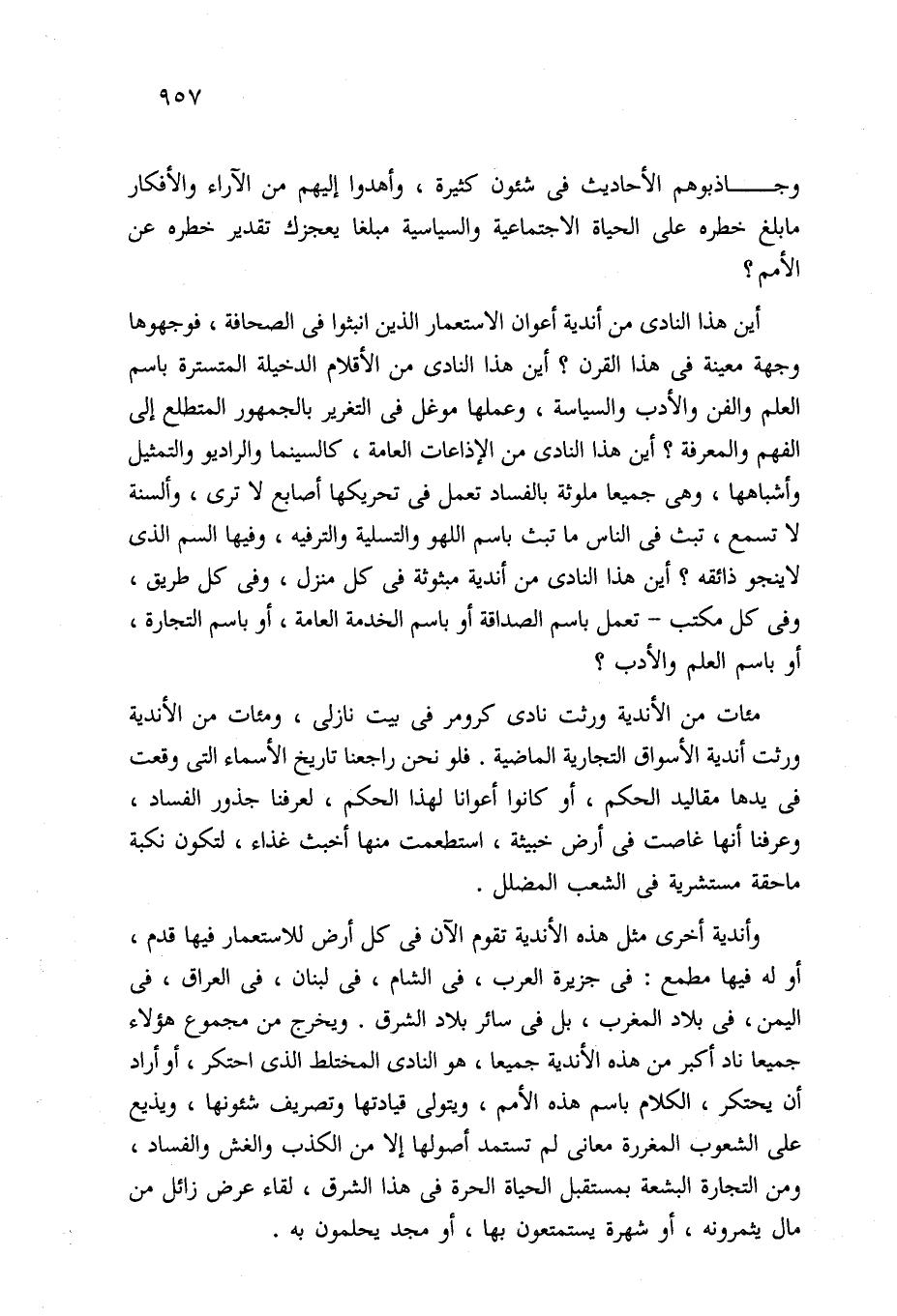 أين هذا النادى من أندية أعوان الاستعمار الذين انبثوا في الصحافة، فوجهوها وجهة معينة في هذا القرن؟ أين هذا النادى من الأقلام الدخيلة المتسترة باسم العلم والفن والأدب والسياسة، وعملها موغل في التغرير بالجمهور المتطلع إلى الفهم والمعرفة؟ أين هذا النادى من الإذاعات العامة، كالسينما والراديو والتمثيل وأشباهها، وهي جميعا ملوثة بالفساد تعمل في تحريكها أصابع لا ترى، وألسنة لا تسمع، تبث في الناس ما تبث باسم اللهو والتسلية والترفيه، وفيها السم الذي لا ينجو ذائقه؟ أين هذا النادى من أندية مبثوثة في كل منزل، وفي كل طريق، وفي كل مكتب- تعمل باسم الصداقة أو باسم الخدمة العامة، أو باسم التجارة، أو باسم العلم والأدب؟