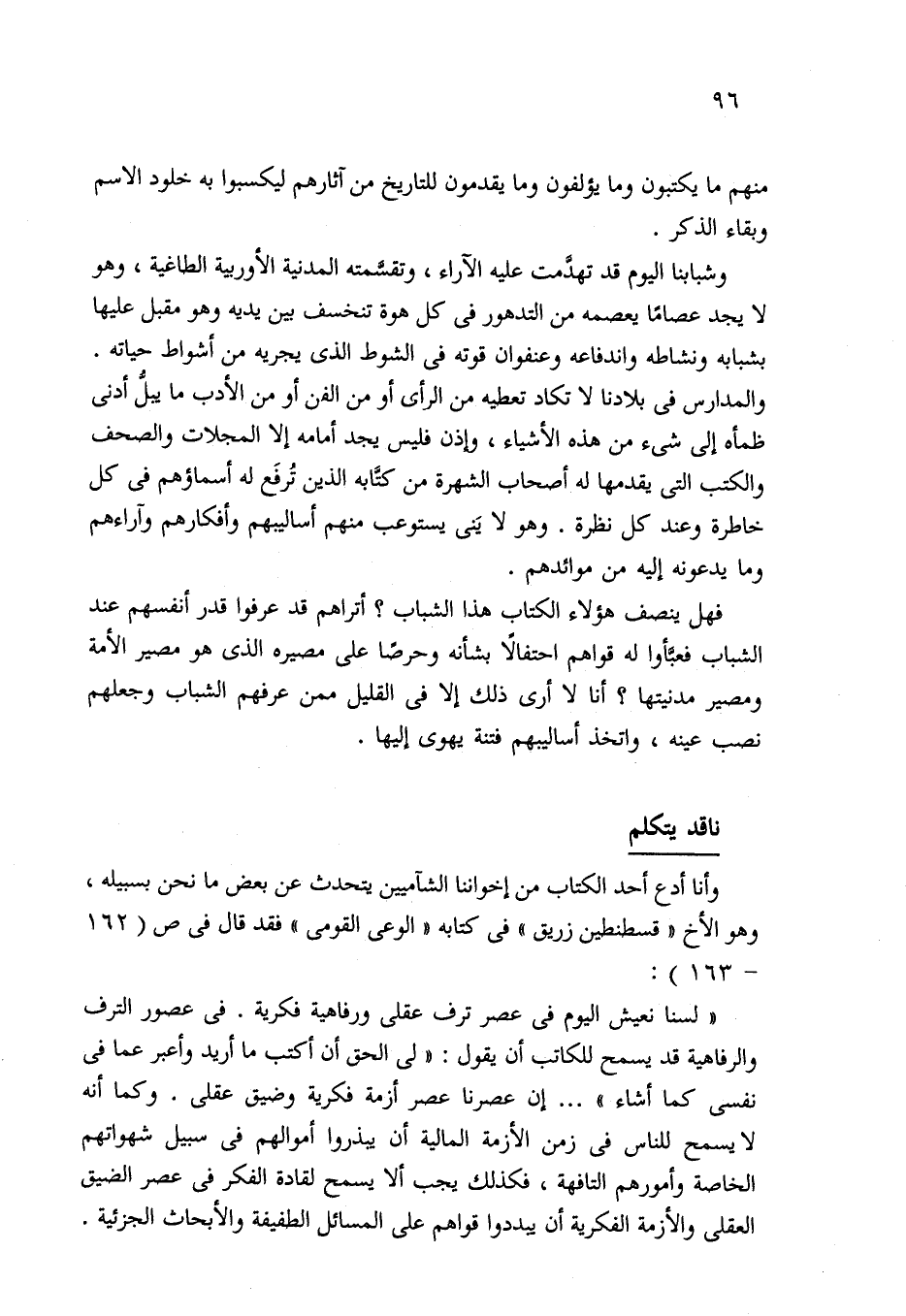 وأنا أدع أحد الكتاب من إخواننا الشآميين يتحدث عن بعض ما نحن بسبيله، وهو الأخ "قسطنطين زريق" في كتابه "الوعي القومي" فقد قال في ص (162 - 163):