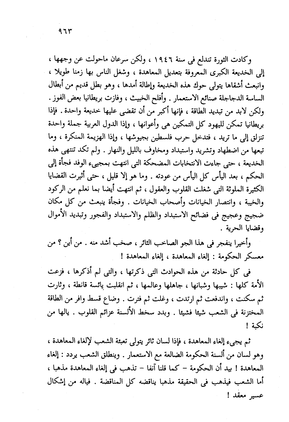 وكادت الثورة تندلع في سنة 1946، ولكن سرعان ما حولت عن وجهها، إلى الخديعة الكبرى المعروفة بتعديل المعاهدة، وشغل الناس بها زمنا طويلا، وانبعث أشقاها يتولى حوك هذه الخديعة وإطالة أمدها، وهو بطل قديم من أبطال الساسة الدجاجلة صنائع الاستعمار. وأفلح الخبيث، وفازت بريطانيا بعض الفوز. ولكن لابد من تبديد الطاقة، فإنها أكبر من أن تقضى عليها خديعة واحدة. فإذا بريطانيا تمكن لليهود كل التمكين هي وأعوانها، وإذا الدول العربية جملة واحدة تنزلق إلى ما تريد، فتدخل حرب فلسطين بجيوشها، وإذا الهزيمة المنكرة، وما تبعها من اضطهاد وتشريد واستبداد ومخاوف بالليل والنهار. ولم تكد تنتهي هذه الخديعة، حتى جاءت الانتخابات المضحكة التي انتهت بمجيئ الوفد فجأة إلى الحكم، بعد اليأس كل اليأس من عودته. وما هو إلا قليل، حتى أثيرت القضايا الكثيرة الملوثة التي شغلت القلوب والعقول، ثم انتهت أيضا بما نعلم من الركود والخيبة، وانتصار الخيانات وأصحاب الخيانات. وفجأة ينبعث من كل مكان ضجيج وعجيج في فضائح الاستبداد والظلم والاستبداد والفجور وتبديد الأموال وقضايا الحرية.