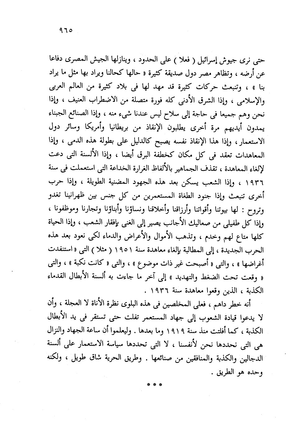 حتى نرى جيوش إسرائيل (فعلا) على الحدود، وينازلها الجيش المصري دفاعا عن أرضه، وتظاهر مصر دول صديقة كثيرة "حالها كحالنا ويراد بها مثل ما يراد بنا"، وتنبعث حركات كثيرة قد مهد لها في بلاد كثيرة من العالم العربي والإسلامي، وإذا الشرق الأدنى كله فورة متصلة من الاضطراب العنيف، وإذا نحن وهم جميعا في حاجة إلى سلاح ليس عندنا شيء منه، وإذا الصنائع الجبناء يمدون أيديهم مرة أخرى يطلبون الإنقاذ من بريطانيا وأمريكا وسائر دول الاستعمار، وإذا هذا الإنقاذ نفسه يصبح كالدليل على بطولة هذه الدمى، وإذا المعاهدات تعقد في كل مكان كخطفة البرق أيضا، وإذا الألسنة التي دعت لإلغاء المعاهدة، تقذف الجماهير بالألفاظ الغرارة الخداعة التي استعملت في سنة 1936، وإذا الشعب يسكن بعد هذه الجهود المضنية الطويلة، وإذا حرب أخرى تنبعث وإذا جنود الطغاة المستعمرين من كل جنس بين ظهرانينا تغدو وتروح: لها بيوتنا وأقواتنا وأرزاقنا وأخلاقنا ونساؤنا وأبناؤنا وتجارنا وموظفونا، وإذا كل طفيلى من صعاليك الأجانب يصير إلى الغنى بإفقار الشعب، وإذا الحياة كلها متاع لهم وخدم، وتذهب الأموال والأعراض والدماء لكي نعود بعد هذه الحرب الجديدة، إلى المطالبة بإلغاء معاهدة سنة 1951 (مثلا) التي "استنفدت أغراضها"، والتي "أصبحت غير ذات موضوع"، والتي "كانت نكبة"، والتي "وقعت تحت الضغط والتهديد" إلى آخر ما جاءت به ألسنة الأبطال القدماء الكذبة، الذين وقعوا معاهدة سنة 1936.