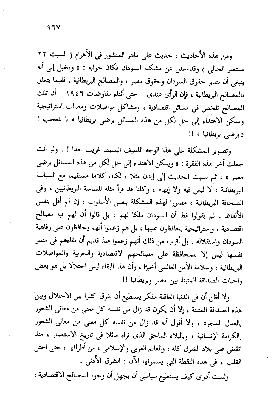 ومن هذه الأحاديث، حديث على ماهر المنشور في الأهرام (السبت 22 سبتمبر الحالي) وقد سئل عن مشكلة السودان فكان جوابه: "ويخيل إلى أنه ينبغي أن نتدبر حقوق السودان وحقوق مصر، والمصالح البريطانية. ففيما يتعلق بالمصالح البريطانية، فإن الرأي عندي -حتى أثناء مفاوضات 1946 - أن تلك المصالح تلخص في مسائل اقتصادية، ومشاكل مواصلات ومطالب استراتيجية ويمكن الاهتداء إلى حل لكل من هذه المسائل يرضى بريطانيا" يا للعجب! "يرضى بريطانيا"! !