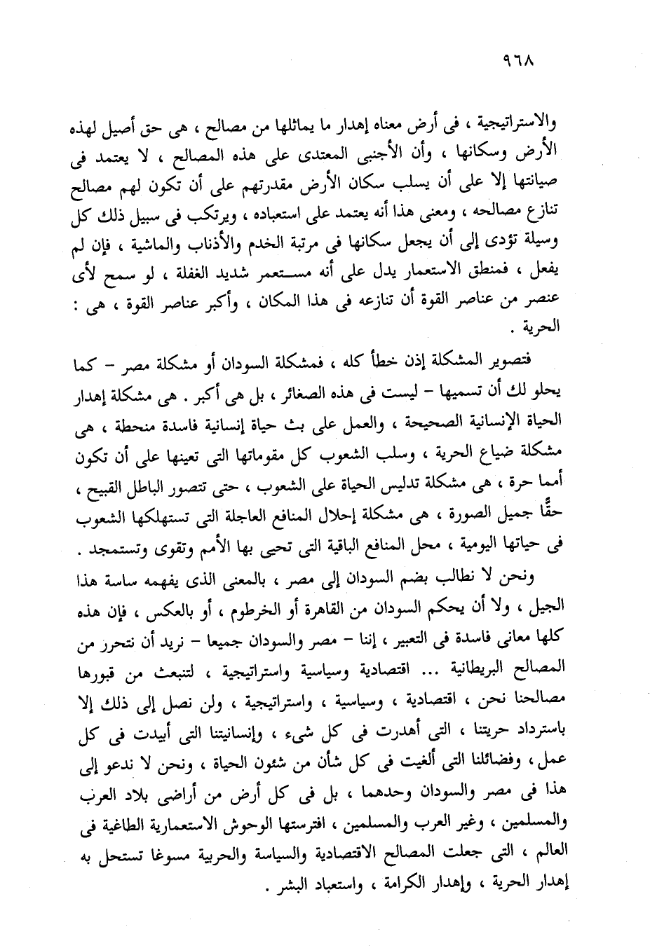 ونحن لا نطالب بضم السودان إلى مصر، بالمعنى الذي يفهمه ساسة هذا الجيل، ولا أن يحكم السودان من القاهرة أو الخرطوم، أو بالعكس، فإن هذه كلها معاني فاسدة في التعبير، إننا -مصر والسودان جميعا- نريد أن نتحرر من المصالح البريطانية. . . اقتصادية وسياسية واستراتيجية، لتنبعث من قبورها مصالحنا نحن، اقتصادية، وسياسية، واستراتيجية، ولن نصل إلى ذلك إلا باسترداد حريتنا، التي أهدرت في كل شيء، وإنسانيتنا التي أبيدت في كل عمل، وفضائلنا التي ألغيت في كل شأن من شئون الحياة، ونحن لا ندعو إلى هذا في مصر والسودان وحدهما، بل في كل أرض من أراضي بلاد العرب والمسلمين، وغير العرب والمسلمين، افترستها الوحوش الاستعمارية الطاغية في العالم، التي جعلت المصالح الاقتصادية والسياسة والحربية مسوغا تستحل به إهدار الحرية، وإهدار الكرامة، واستعباد البشر.