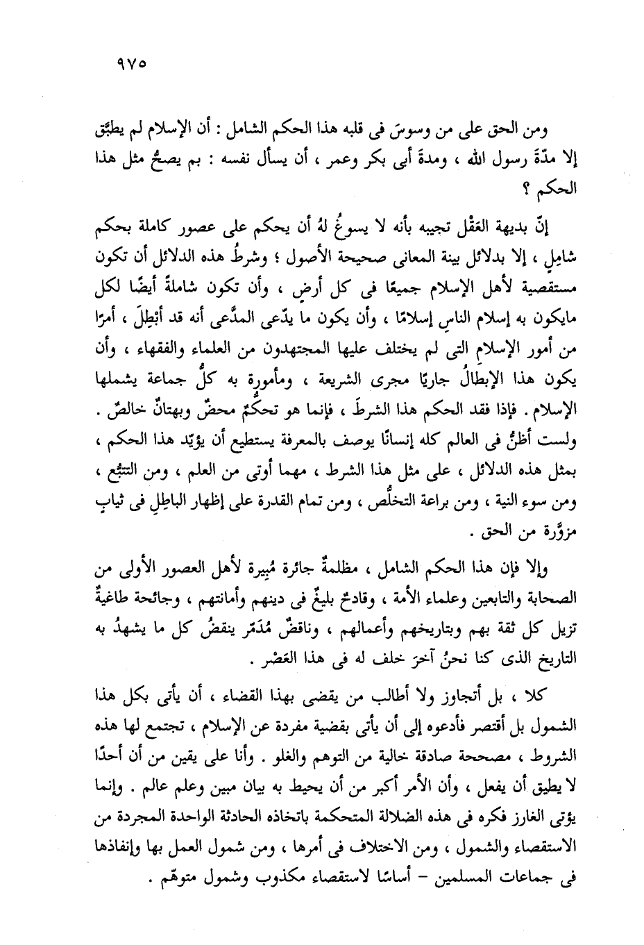 ومن الحق على من وسوسَ في قلبه هذا الحكم الشامل: أن الإسلام لم يطبَّق إلا مدّةَ رسول الله، ومدةَ أبي بكر وعمر، أن يسأل نفسه: بم يصحُّ مثل هذا الحكم؟