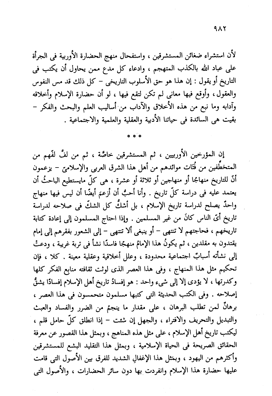 لأن استشراء ضغائن المستشرقين، واستفحال منهج الحضارة الأوربية في الجرأة على عباد الله بالكذب المتهجم، وادعاء كل مدع ممن يحاول أن يكتب في التاريخ أو يقول: إن هذا هو حق الأسلوب التاريخي -كل ذلك قد مس النفوس والعقول، وأوقع فيها معاني لم تكن لتقع فيها، لو أن حضارة الإسلام وأخلاقه وآدابه وما نبع من هذه الأخلاق والآداب من أساليب العلم والبحث والفكر- بقيت هي السائدة في حياتنا الأدبية والعقلية والعلمية والاجتماعية.
