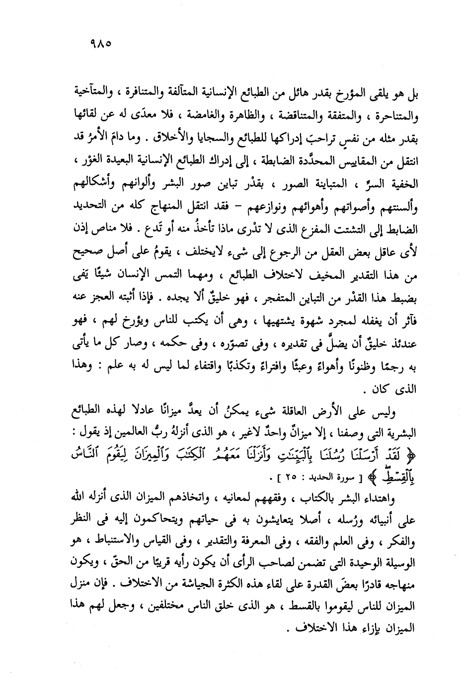 وليس على الأرض العاقلة شيء يمكنُ أن يعدَّ ميزانًا عادلا لهذه الطبائع البشرية التي وصفنا، إلا ميزان واحدٌ لا غير، هو الذي أنزلهُ ربُّ العالمين إذ يقول: {لَقَدْ أَرْسَلْنَا رُسُلَنَا بِالْبَيِّنَاتِ وَأَنْزَلْنَا مَعَهُمُ الْكِتَابَ وَالْمِيزَانَ لِيَقُومَ النَّاسُ بِالْقِسْطِ} [سورة الحديد: 25].