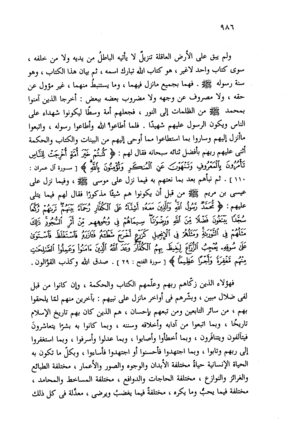 ولم يبق على الأرض العاقلة تنزيلٌ لا يأتيه الباطلُ من يديه ولا من خلفه، سوى كتاب واحد لا غير، هو كتاب الله تبارك اسمه، ثم بيان هذا الكتاب، وهو سنة رسوله - صلى الله عليه وسلم -. فهما بجميع ما نزل فيهما، وما يستنبطُ منهما، غير مؤول عن حقه، ولا مصروف عن وجهه ولا مضروب بعضه ببعض: أخرجا الذين آمنوا بمحمد - صلى الله عليه وسلم - من الظلمات إلى النور، فجعلهم أمة وسطًا ليكونوا شهداء على الناس ويكون الرسول عليهم شهيدًا. فلما أطاعوا الله وأطاعوا رسوله، واتبعوا ما أنزل إليهم وساروا بما استطاعوا مما أوحي إليهم من البينات والكتاب والحكمة أثنى عليهم ربهم بأفضل ثنائه سبحانه فقال لهم: {كُنْتُمْ خَيْرَ أُمَّةٍ أُخْرِجَتْ لِلنَّاسِ تَأْمُرُونَ بِالْمَعْرُوفِ وَتَنْهَوْنَ عَنِ الْمُنْكَرِ وَتُؤْمِنُونَ بِاللَّهِ} [سورة آل عمران: 110]. ثم نبأهم بعد بما نعتهم به فيما نزل على موسى - صلى الله عليه وسلم -، وفيما نزل على عيسى بن مريم - صلى الله عليه وسلم - من قبل أن يكونوا هم شيئًا مذكورًا فقال لهم فيما يتلى عليهم: {مُحَمَّدٌ رَسُولُ اللَّهِ وَالَّذِينَ مَعَهُ أَشِدَّاءُ عَلَى الْكُفَّارِ رُحَمَاءُ بَيْنَهُمْ تَرَاهُمْ رُكَّعًا سُجَّدًا يَبْتَغُونَ فَضْلًا مِنَ اللَّهِ وَرِضْوَانًا سِيمَاهُمْ فِي وُجُوهِهِمْ مِنْ أَثَرِ السُّجُودِ ذَلِكَ مَثَلُهُمْ فِي التَّوْرَاةِ وَمَثَلُهُمْ فِي الْإِنْجِيلِ كَزَرْعٍ أَخْرَجَ شَطْأَهُ فَآزَرَهُ فَاسْتَغْلَظَ فَاسْتَوَى عَلَى سُوقِهِ يُعْجِبُ الزُّرَّاعَ لِيَغِيظَ بِهِمُ الْكُفَّارَ وَعَدَ اللَّهُ الَّذِينَ آمَنُوا وَعَمِلُوا الصَّالِحَاتِ مِنْهُمْ مَغْفِرَةً وَأَجْرًا عَظِيمًا} [سورة الفتح: 29]. صدق الله وكذب القوَّالون.