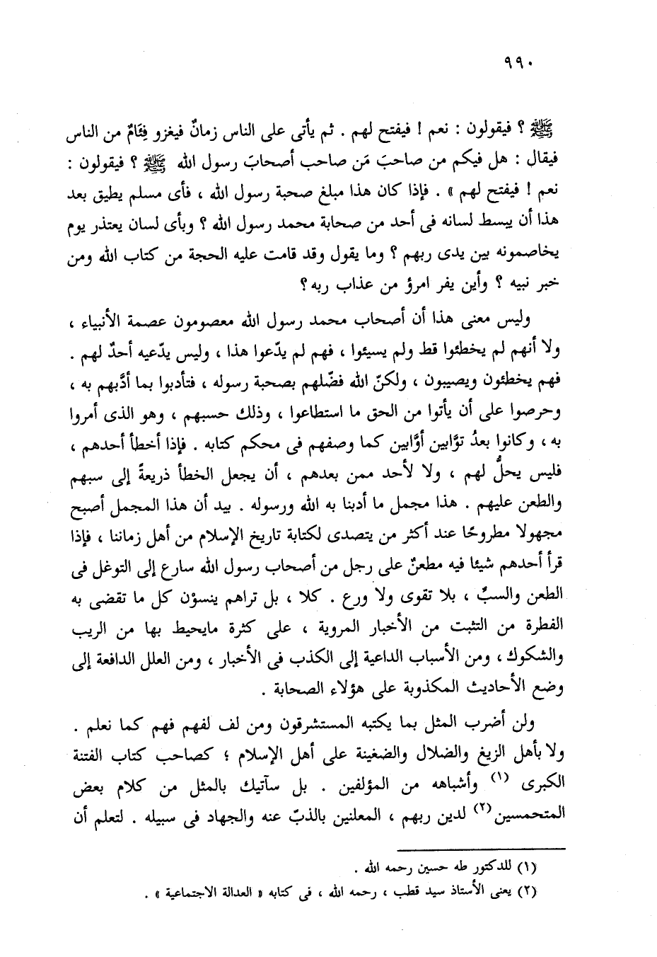 وليس معنى هذا أن أصحاب محمد رسول الله معصومون عصمة الأنبياء، ولا أنهم لم يخطئوا قط ولم يسيئوا، فهم لم يدّعوا هذا، وليس يدّعيه أحدٌ لهم. فهم يخطئون ويصيبون، ولكنّ الله فضّلهم بصحبة رسوله، فتأدبوا بما أدَّبهم به، وحرصوا على أن يأتوا من الحق ما استطاعوا، وذلك حسبهم، وهو الذي أمروا به، وكانوا بعدُ توَّابين أوَّابين كما وصفهم في محكم كتابه. فإذا أخطأ أحدهم، فليس يحلُّ لهم، ولا لأحد ممن بعدهم، أن يجعل الخطأ ذريعةً إلى سبهم والطعن عليهم. هذا مجمل ما أدبنا به الله ورسوله. بيد أن هذا المجمل أصبح مجهولا مطروحًا عند أكثر من يتصدى لكتابة تاريخ الإسلام من أهل زماننا، فإذا قرأ أحدهم شيئا فيه مطعنٌ على رجل من أصحاب رسول الله سارع إلى التوغل في الطعن والسبِّ، بلا تقوى ولا ورع. كلا، بل تراهم ينسوْن كل ما تقضى به الفطرة من التثبت من الأخبار المروية، على كثرة ما يحيط بها من الريب والشكوك، ومن الأسباب الداعية إلى الكذب في الأخبار، ومن العلل الدافعة إلى وضع الأحاديث المكذوبة على هؤلاء الصحابة.