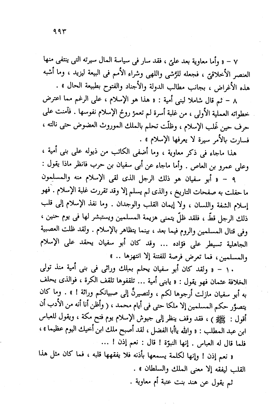 8 - ثم قال شاملا لبنى أمية: "هذا هو الإسلام، على الرغم مما اعترض خطواته العملية الأولى، من غلبة أسرة لم تعمرْ روحُ الإسلام نفوسها. فآمنت على حرف حين غَلب الإسلام، وظلّت تحلم بالملك الموروث العضوض حتى نالته، فسارت بالأمر سيرة لا يعرفها الإسلام".