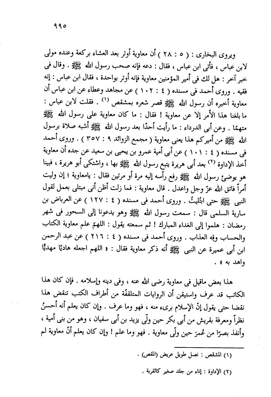 ويروى البخاري: (5: 28) أن معاوية أوتر بعد العشاء بركعة وعنده مولى لابن عباس، فأتى ابن عباس، فقال: دعه فإنه صحب رسول الله - صلى الله عليه وسلم -. وقال في خبر آخر: هل لك في أمير المؤمنين معاوية فإنه أوتر بواحدة، فقال ابن عباس: إنه فقيه. وروى أحمد في مسنده (4: 102) عن مجاهد وعطاء عن ابن عباس أن معاوية أخبره أن رسول الله - صلى الله عليه وسلم - قصر شعره بمشقص (¬1). فقلت لابن عباس: ما بلغنا هذا الأمر إلا عن معاوية! فقال: ما كان معاوية على رسول الله - صلى الله عليه وسلم - متهمًا. وعن أبي الدرداء: ما رأيت أحدًا بعد رسول الله - صلى الله عليه وسلم - أشبه صلاة برسول الله - صلى الله عليه وسلم - من أميركم هذا يعني معاوية (مجمع الزوائد 9: 357). وروى أحمد في مسنده (4: 101) عن أبي أمية عمرو بن يحيى بن سعيد عن جده أن معاوية أخذ الإداوة (¬2) بعد أبي هريرة يتبع رسول الله - صلى الله عليه وسلم - بها، واشتكى أبو هريرة، فبينا هو يوضئ رسول الله - صلى الله عليه وسلم - رفع رأسه إليه مرة أو مرتين فقال: يا معاوية؛ إن وليت أمرًا فاتق الله -عزّ وجل- واعدل. قال معاوية: فما زلت أظن أنى مبتلى بعمل لقول النبي - صلى الله عليه وسلم - حتى ابتُليتُ. وروى أحمد في مسنده (4: 127) عن العرباض بن سارية السلمى قال: سمعت رسول الله - صلى الله عليه وسلم - وهو يدعونا إلى السحور في شهر رمضان: هلموا إلى الغداء المبارك! ثم سمعته يقول: اللهمّ علم معاوية الكتاب والحساب وقِه العذاب. وروى أحمد في مسنده (4: 216) عن عبد الرحمن ابن أبي عميرة عن النبي - صلى الله عليه وسلم - أنه ذكر معاوية فقال: "اللهم اجعله هاديًا مهديًّا واهد به".