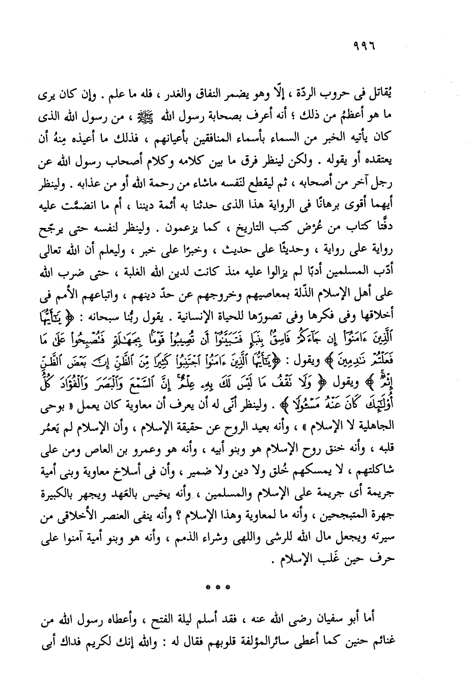 يُقاتل في حروب الردّة، إلّا وهو يضمر النفاق والغدر، فله ما علم. وإن كان يرى ما هو أعظمُ من ذلك؛ أنه أعرف بصحابة رسول الله - صلى الله عليه وسلم -، من رسول الله الذي كان يأتيه الخبر من السماء بأسماء المنافقين بأعيانهم، فذلك ما أعيذه مِنهُ أن يعتقده أو يقوله. ولكن لينظر فرق ما بين كلامه وكلام أصحاب رسول الله عن رجل آخر من أصحابه، ثم ليقطع لنَفسه ما شاء من رحمة الله أو من عذابه. ولينظر أيهما أقوى برهانًا في الرواية هذا الذي حدثنا به أئمة ديننا، أم ما انضمَّت عليه دفَّتا كتاب من عُرْض كتب التاريخ، كما يزعمون. ولينظر لنفسه حتى يرجّح رواية على رواية، وحديثًا على حديث، وخبرًا على خبر، وليعلم أن الله تعالى أدّب المسلمين أدبًا لم يزالوا عليه منذ كانت لدين الله الغلبة، حتى ضرب الله على أهل الإسلام الذّلة بمعاصيهم وخروجهم عن حدّ دينهم، واتباعهم الأمم في أخلاقها وفي فكرها وفي تصورّها للحياة الإنسانية. يقول ربُّنا سبحانه: {يَاأَيُّهَا الَّذِينَ آمَنُوا إِنْ جَاءَكُمْ فَاسِقٌ بِنَبَإٍ فَتَبَيَّنُوا أَنْ تُصِيبُوا قَوْمًا بِجَهَالَةٍ فَتُصْبِحُوا عَلَى مَا فَعَلْتُمْ نَادِمِينَ} ويقول: {يَاأَيُّهَا الَّذِينَ آمَنُوا اجْتَنِبُوا كَثِيرًا مِنَ الظَّنِّ إِنَّ بَعْضَ الظَّنِّ إِثْمٌ} ويقول {وَلَا تَقْفُ مَا لَيْسَ لَكَ بِهِ عِلْمٌ إِنَّ السَّمْعَ وَالْبَصَرَ وَالْفُؤَادَ كُلُّ أُولَئِكَ كَانَ عَنْهُ مَسْئُولًا}. ولينظر أنّى له أن يعرف أن معاوية كان يعمل "بوحي الجاهلية لا الإسلام"، وأنه بعيد الروح عن حقيقة الإسلام، وأن الإسلام لم يَعمُر قلبه، وأنه خنق روح الإسلام هو وبنو أبيه، وأنه هو وعمرو بن العاص ومن على شاكلتهم، لا يمسكهم خُلق ولا دين ولا ضمير، وأن في أسلاخ معاوية وبنى أمية جريمة أي جريمة على الإسلام والمسلمين، وأنه يخيس بالعَهد ويجهر بالكبيرة جهرة المتبجحين، وأنه ما لمعاوية وهذا الإسلام؟ وأنه ينفي العنصر الأخلاقى من سيرته ويجعل مال الله للرشى واللهي وشراء الذمم، وأنه هو وبنو أمية آمنوا على حرف حين غَلب الإسلام.