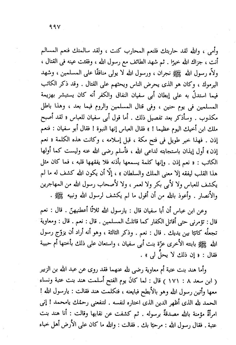 وعن ابن عباس أن أبا سفيان قال: يا رسول الله ثلاثًا أعطنيهنّ. قال: نعم قال: تؤمرنى حتى أقاتل الكفار كما قاتلتُ المسلمين. قال: نعم. قال: ومعاوية تجعلُه كاتبًا بين يديك. قال: نعم. وذكر الثالثة، وهو أنه أراد أن يزوّج رسول الله - صلى الله عليه وسلم - بابنته الأخرى عزّة بنت أبي سفيان، واستعان على ذلك بأختها أم حبيبة فقال: "إن ذلك لا يحلُّ لي".
