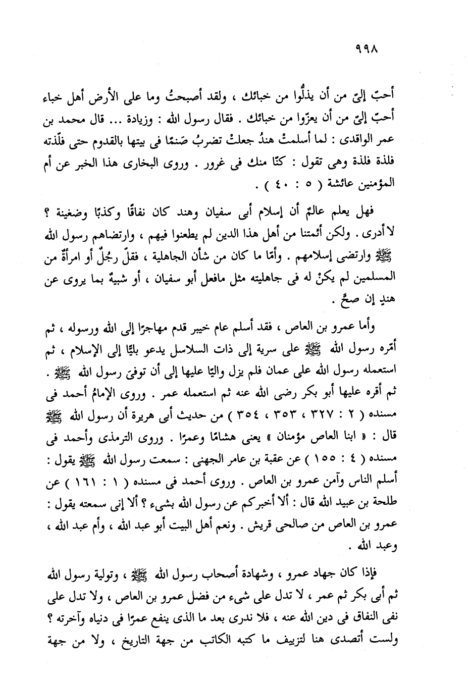 وأما عمرو بن العاص، فقد أسلم عام خيبر قدم مهاجرًا إلى الله ورسوله، ثم أمّره رسول الله - صلى الله عليه وسلم - على سرية إلى ذات السلاسل يدعو بليًّا إلى الإسلام، ثم استعمله رسول الله على عمان فلم يزل واليًا عليها إلى أن توفيَ رسول الله - صلى الله عليه وسلم -. ثم أقره عليها أبو بكر - رضي الله عنه - ثم استعمله عمر. وروى الإمامُ أحمد في مسنده (2: 327، 353، 354) من حديث أبي هريرة أن رسول الله - صلى الله عليه وسلم - قال: "ابنا العاص مؤمنان" يعني هشامًا وعمرًا. وروى الترمذي وأحمد في مسنده (4: 155) عن عقبة بن عامر الجهني: سمعت رسول الله - صلى الله عليه وسلم - يقول: أسلم الناس وآمن عمرو بن العاص. وروى أحمد في مسنده (1: 161) عن طلحة بن عبيد الله قال: ألا أخبركم عن رسول الله بشيء؟ ألا إني سمعته يقول: عمرو بن العاص من صالحي قريش. ونعم أهل البيت أبو عبد الله، وأم عبد الله، وعبد الله.