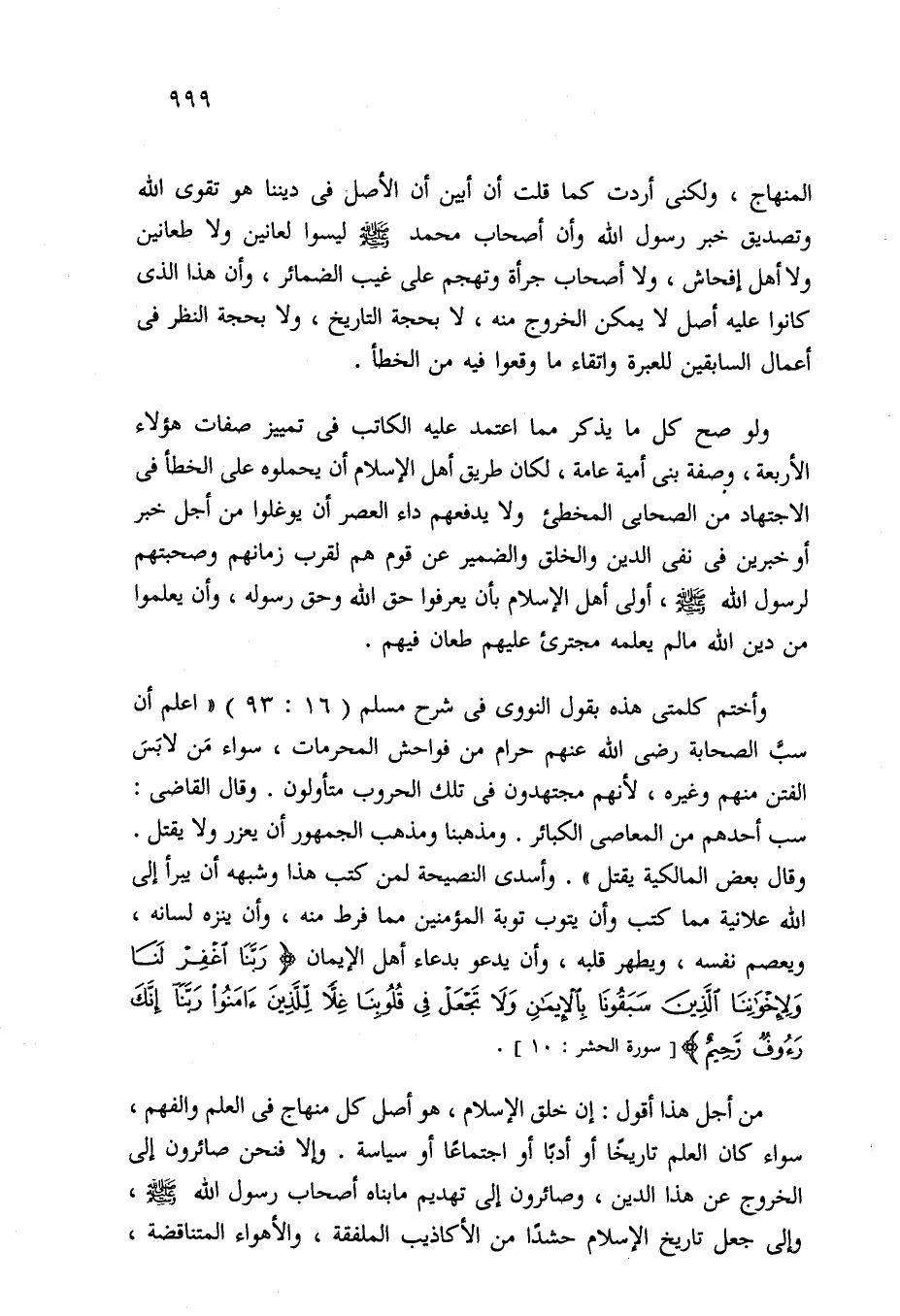 المنهاج، ولكني أردت كما قلت أن أبين أن الأصل في ديننا هو تقوى الله وتصديق خبر رسول الله وأن أصحاب محمد - صلى الله عليه وسلم - ليسوا لعانين ولا طعانين ولا أهل إفحاش، ولا أصحاب جرأة وتهجم على غيب الضمائر، وأن هذا الذي كانوا عليه أصل لا يمكن الخروج منه، لا بحجة التاريخ، ولا بحجة النظر في أعمال السابقين للعبرة واتقاء ما وقعوا فيه من الخطأ.