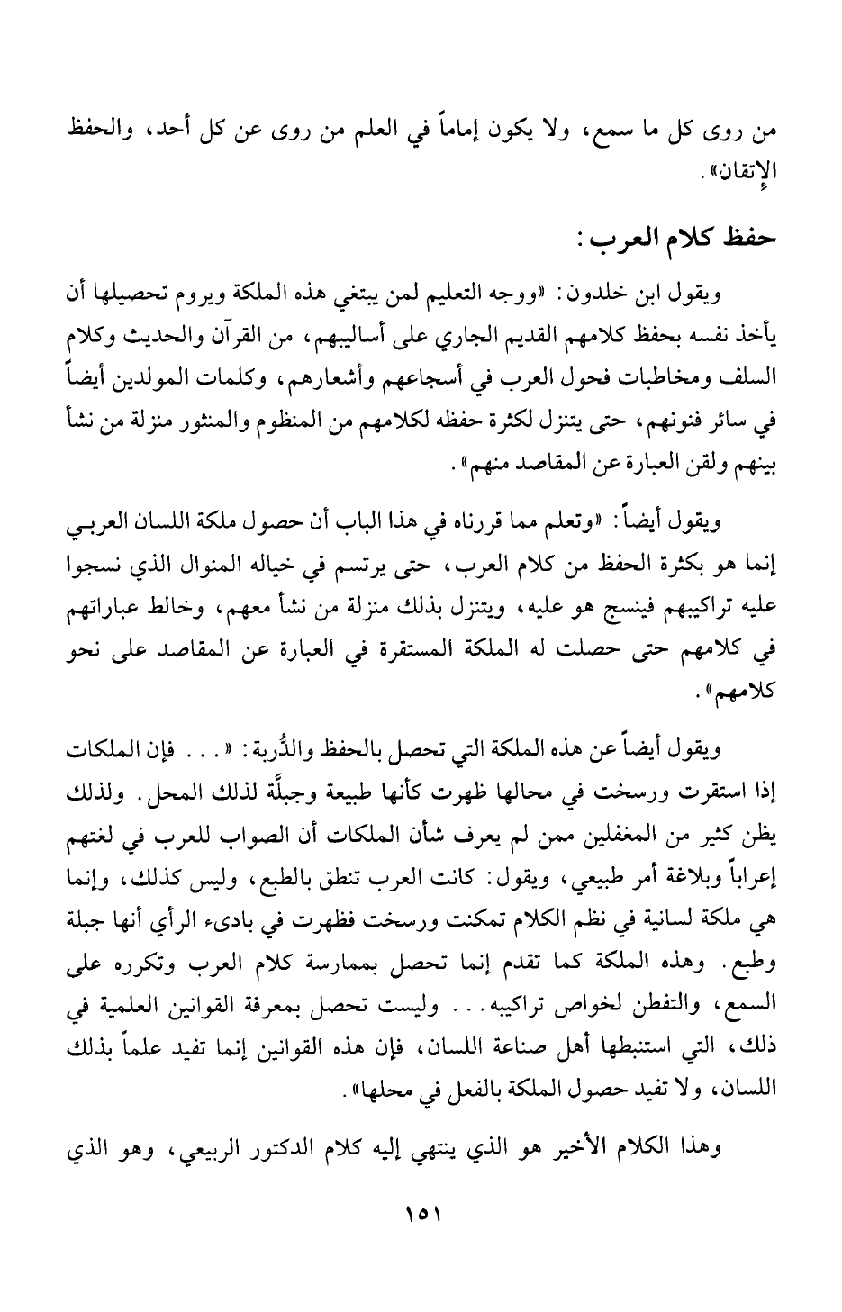 ويقول ايضاً: " وتعلم مما قررناه في هذا الباب أن حصول ملكة اللسان العربي