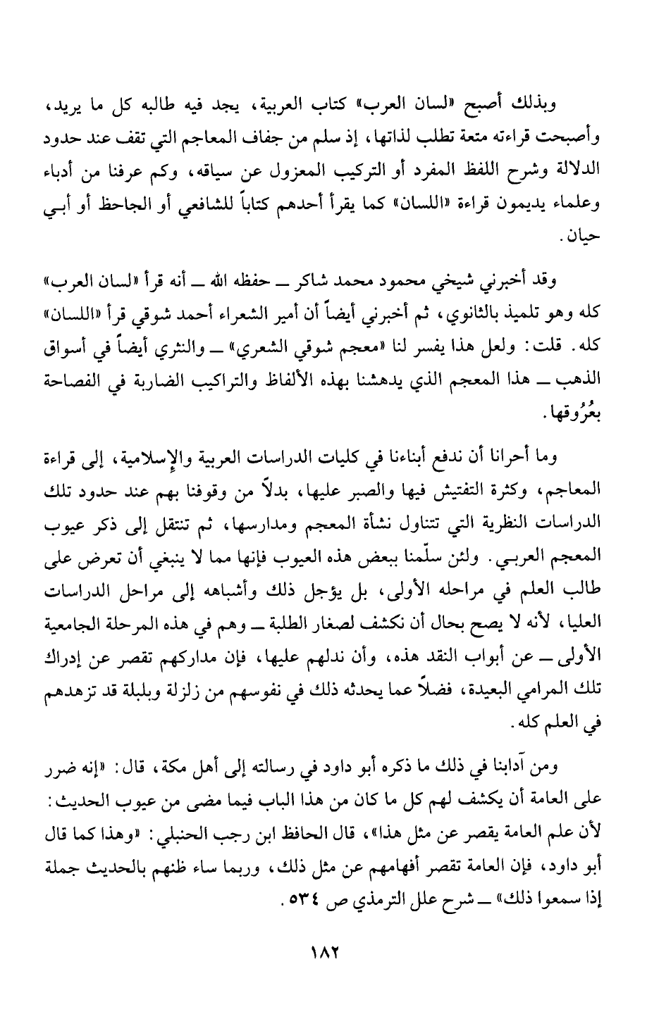 وقد أخبرني شيخي محمود محمد شاكر - حفظه اللّه - انه قرأ " لسان العرب "