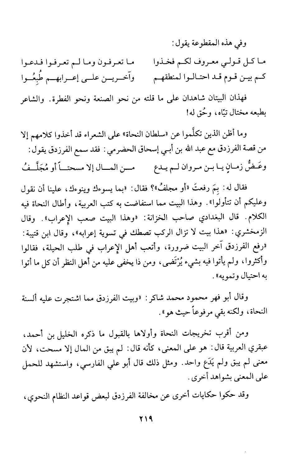 وقال أبو فهر محمود محمد شاكر: " وبيت الفرزدق مما اشتجرت عليه السنة