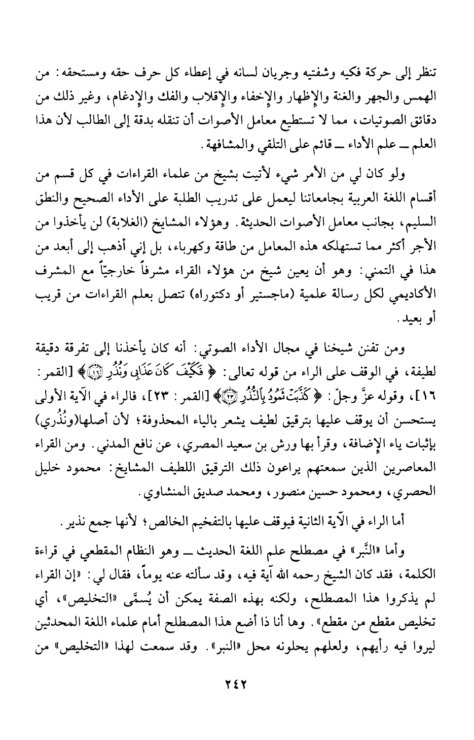 الكلمة، فقد كان الشيخ رحمه الله آية فيه، وقد سألته عنه يوماً، فقال لي: " إن القراء