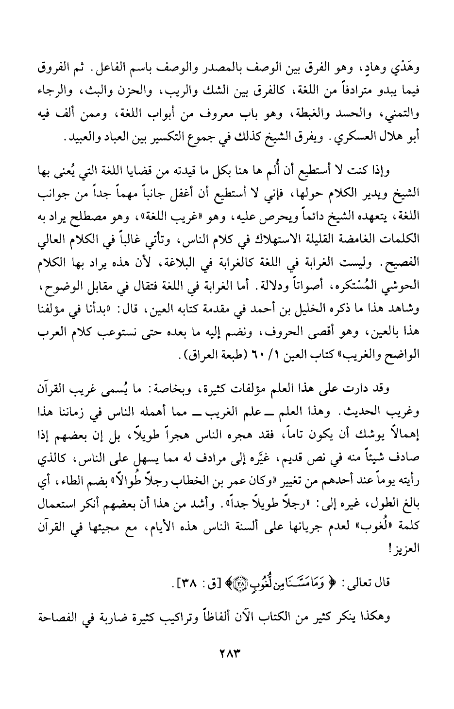 اللغة، يتعهده الشيخ دائماً ويحرص عليه، وهو "غريب اللغة "، وهو مصطلج يراد به