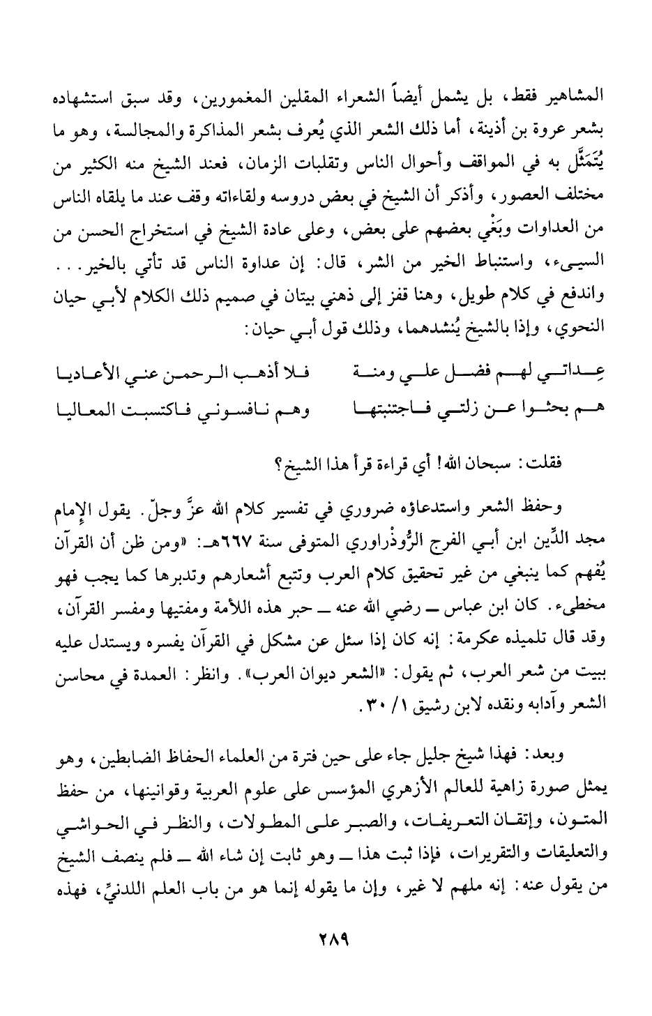 يُتَمَثَّل به في المواقف واحوالى الناس وتقلبات الزمان، فعند الشيخ منه الكثير من