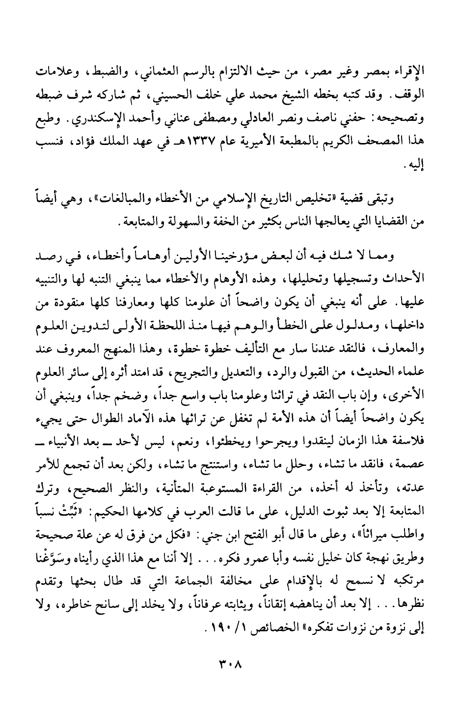 وتبقى قضية "تخليص التاريخ الِإسلامي من الأخطاء والمبالغات "، وهي أيضاَ