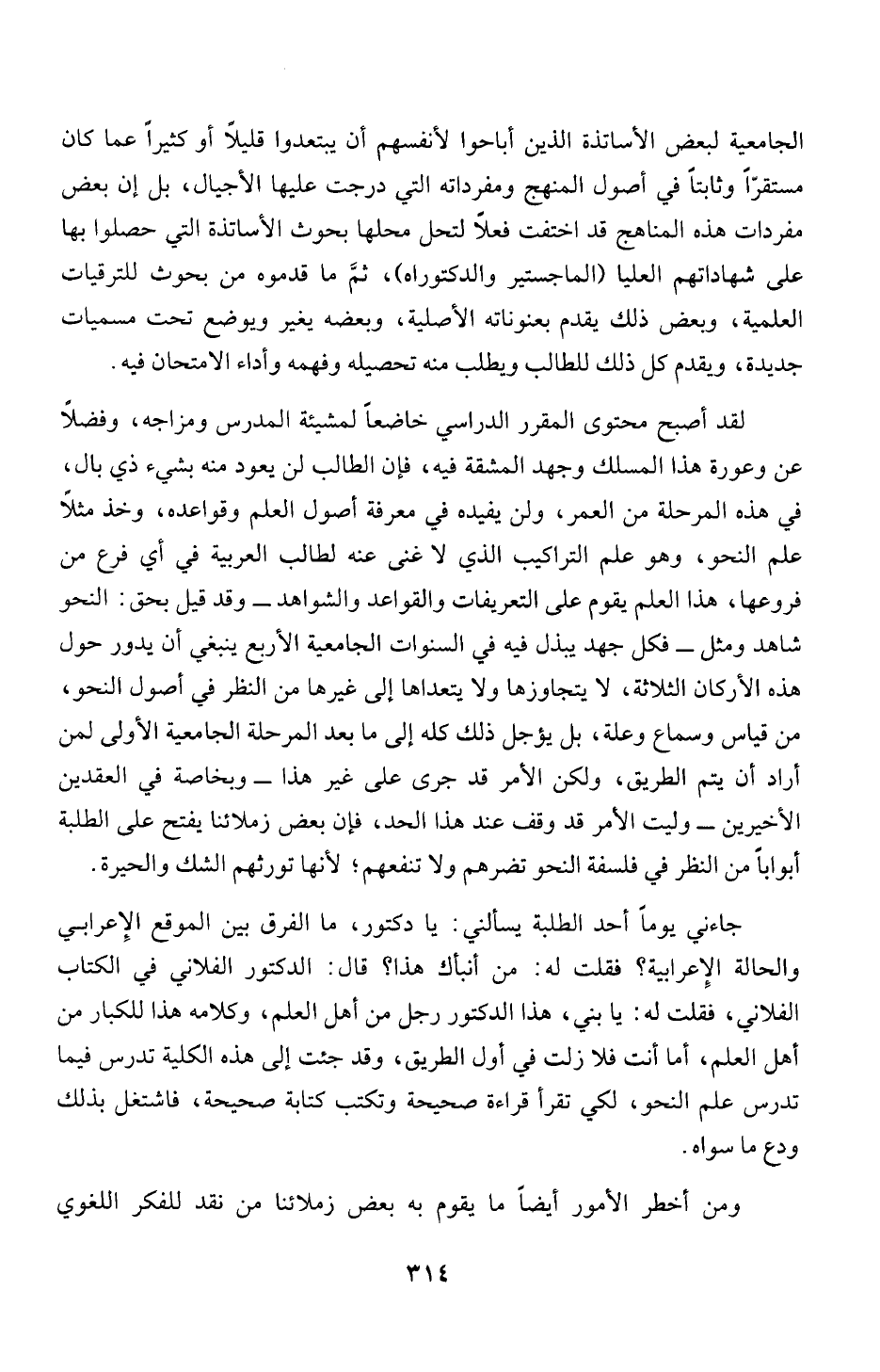 من قياس وسماع وعلة، بل يؤجل ذلك كله إلى ما بعد المرحلة الجامعية الأولى لمن