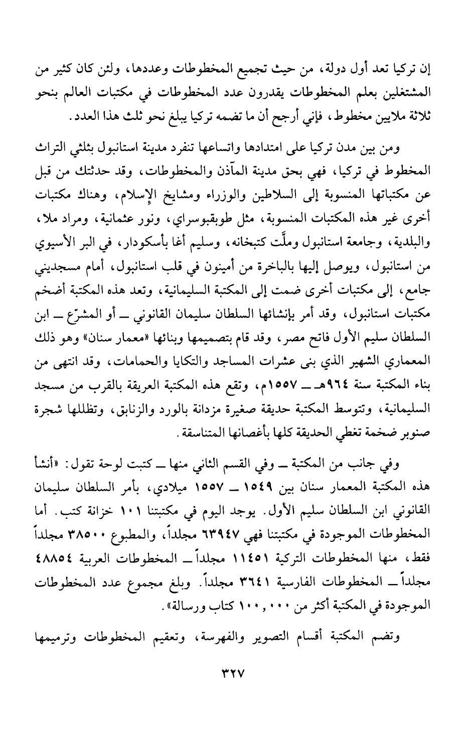 ثلاثة ملايين مخطوط، فإني أرجح أن ما تضمه تركيا يبلغ نحو ثلث هذا العدد.